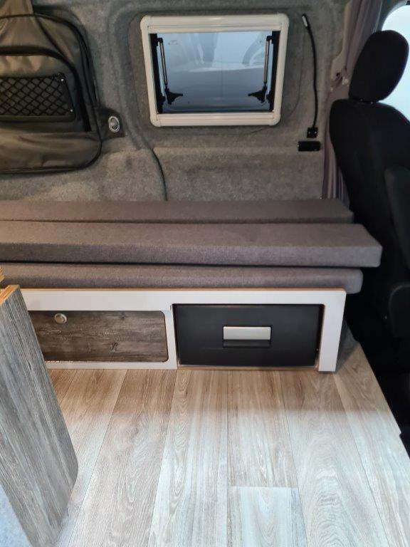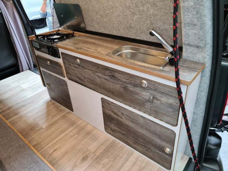 The conversion will be at the passenger side rear, so you still have both side door and rear door access. As standard it will a single ring hob with sink, gas bottle, mains hook up with leisure battery, solar panel, LED lights, stick on window blinds, water pump. Fresh & wastewater containers or a straight through wastewater pipe if required.