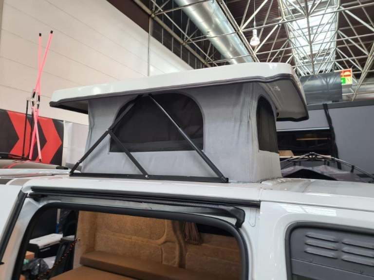 Pop top roof. (Picture shows the same roof on another vehicle) This is a simple pop-up square roof that gives headroom over the kitchen area.