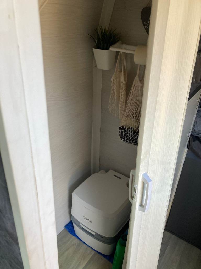 There’s a small toilet area with a bi-folding door and a portable toilet.