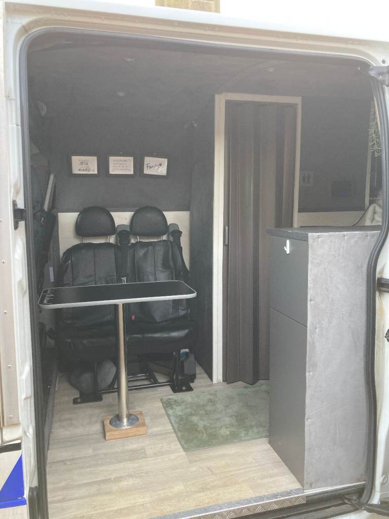 The main section of the van has 2 proper seats next to the table, with seat belts. So it still has 5 seats total.