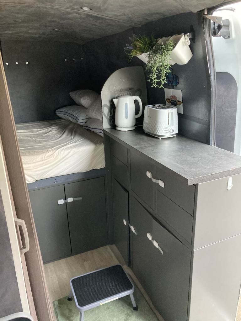 A few cupoard's for storage of all the cutlery/plates etc, loads of random pockets in the front to store loads of handy camping items. A storage shelf above the seats holds bedding.
