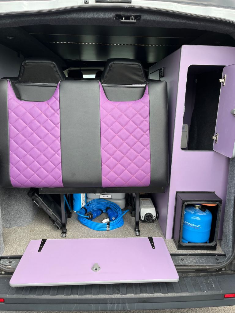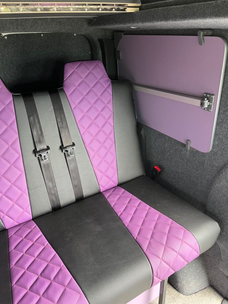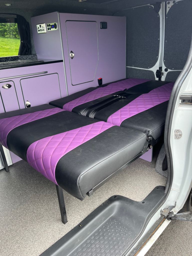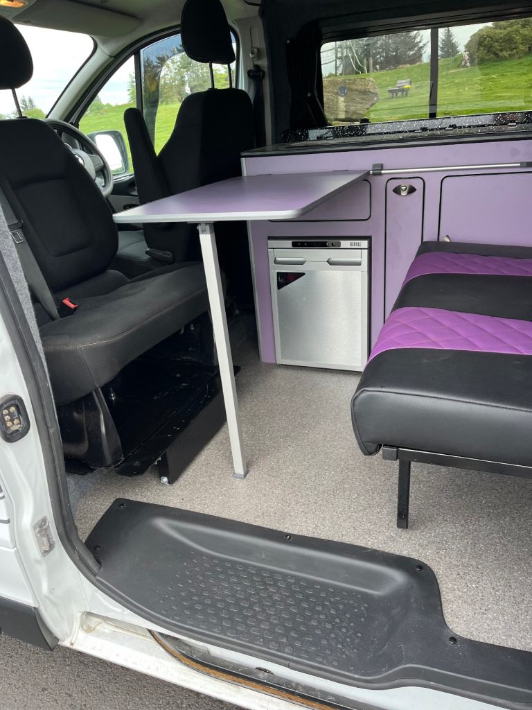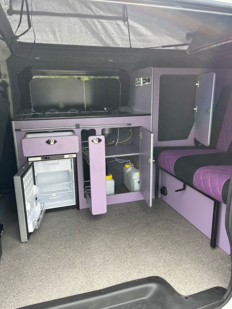 Excellent white bodywork. Purple furniture. Only done 86,202 miles from new. Mot’d for one year. Just had a full service. Pop top roof bed. Central locking. Electric windows. Thetford double burner LPG hob with integral sink and tap. 12v silver compressor fridge. Cutlery drawer and pull out basket. 230v hook up point. 230v double socket with USB’S. 12v blue led control panel with USB’S. 12v led down lights. 12v adjustable light in pop top bed area. Purple/black rock n roll bed with seatbelts.