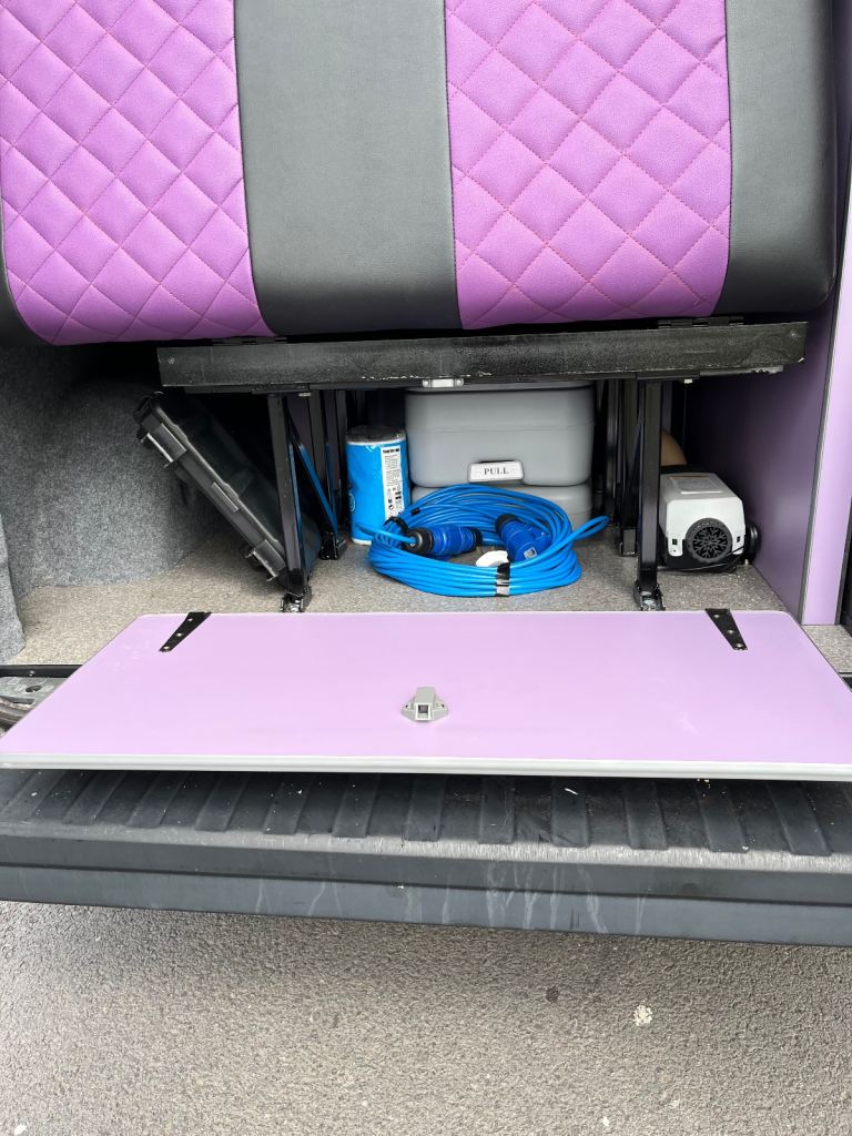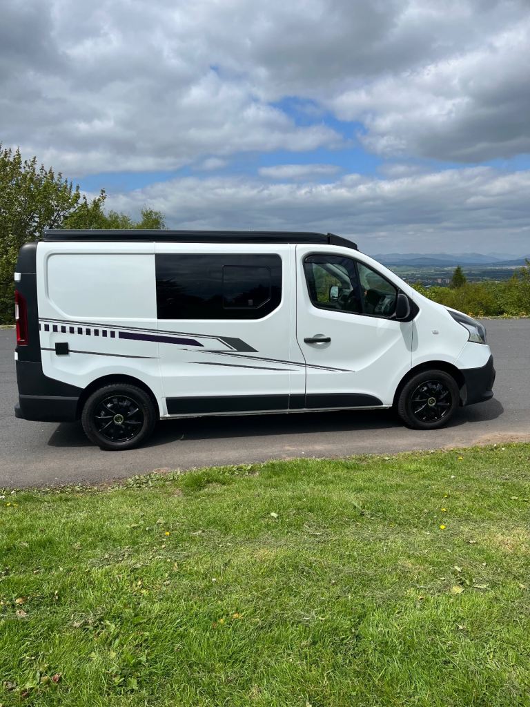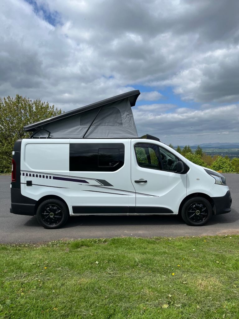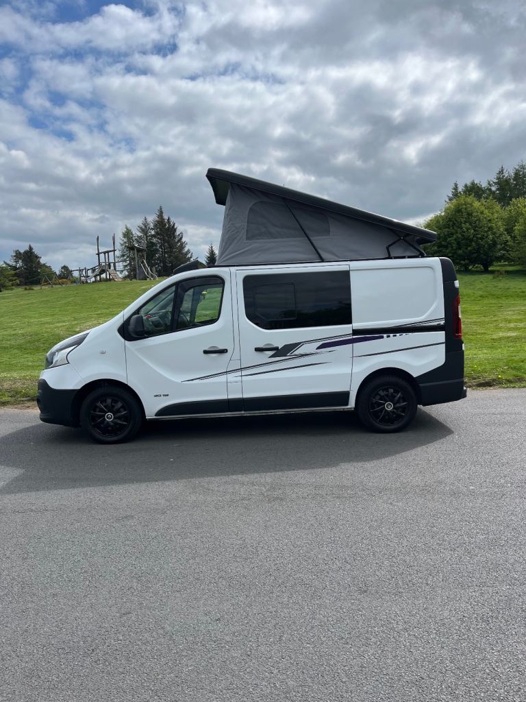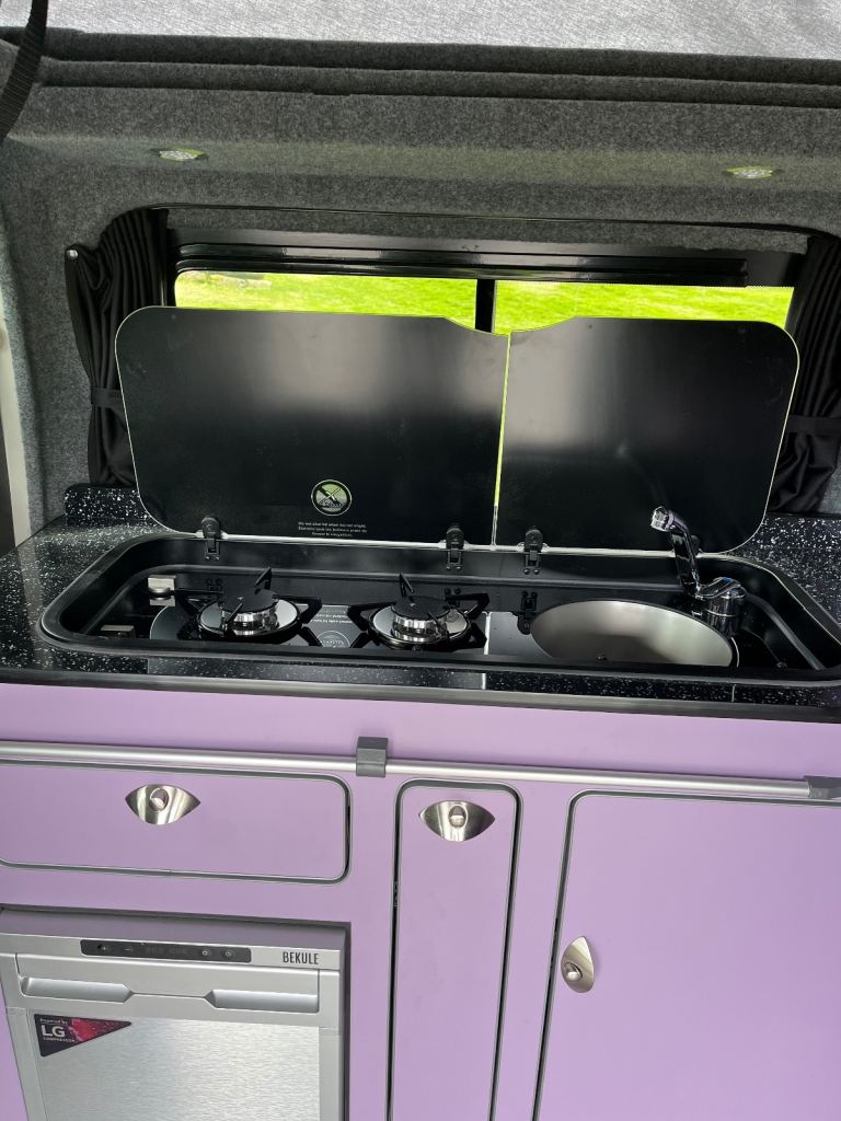 Excellent white bodywork. Purple furniture. Only done 86,202 miles from new. Mot’d for one year. Just had a full service. Pop top roof bed. Central locking. Electric windows. Thetford double burner LPG hob with integral sink and tap. 12v silver compressor fridge. Cutlery drawer and pull out basket. 230v hook up point. 230v double socket with USB’S. 12v blue led control panel with USB’S. 12v led down lights. 12v adjustable light in pop top bed area. Purple/black rock n roll bed with seatbelts.