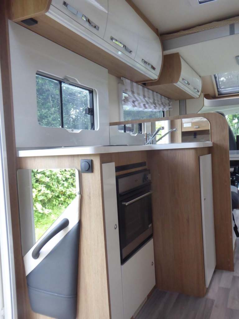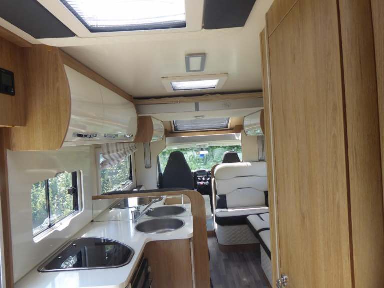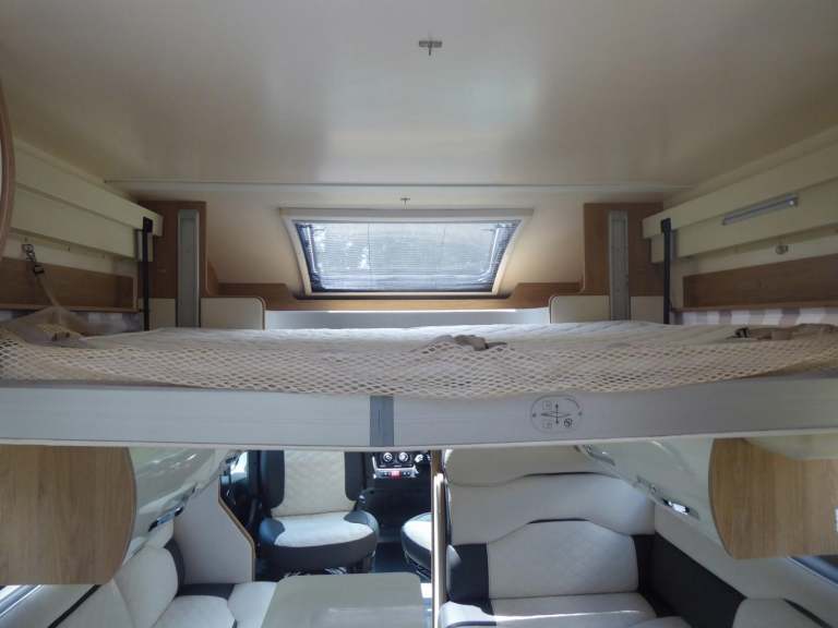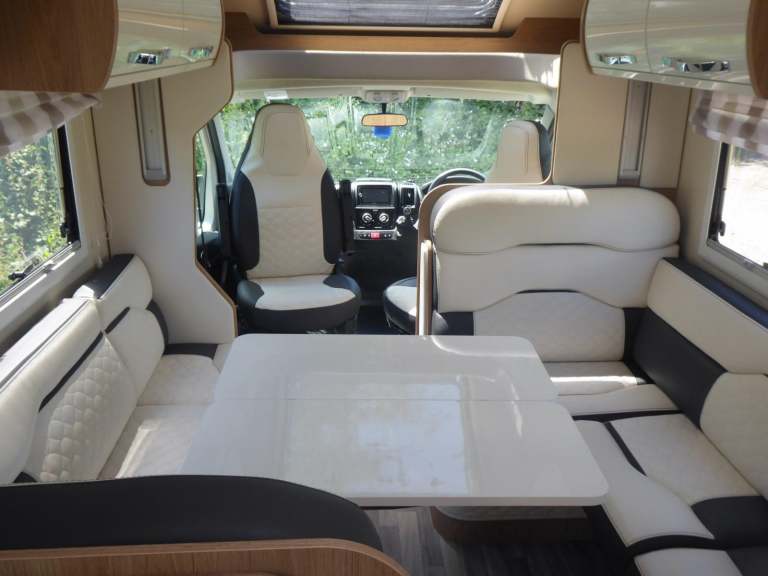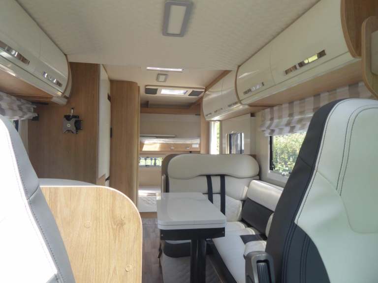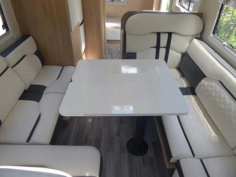 Behind the cab position is a dining and leisure area with 2 L-shaped seating (with two additional forward facing seat belts) and table, that is well lit by the surrounding windows and over cab skylight. area also serves an electrically operated drop-down transverse double bed.