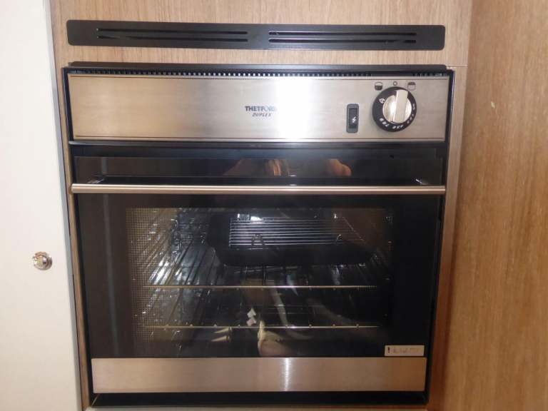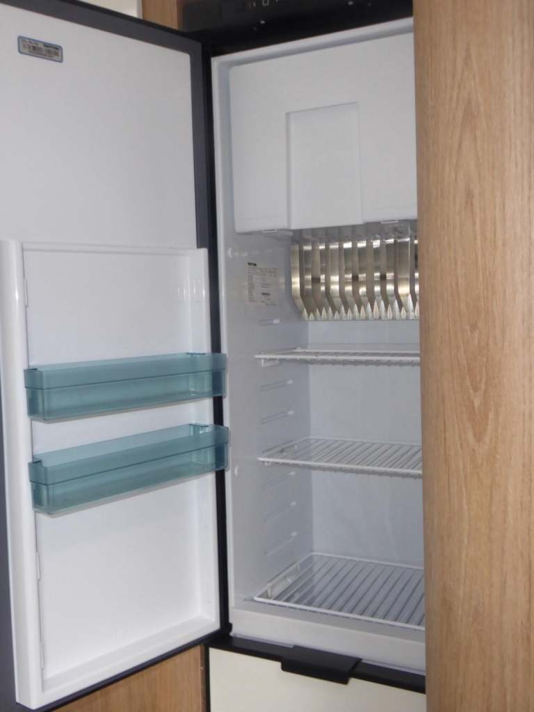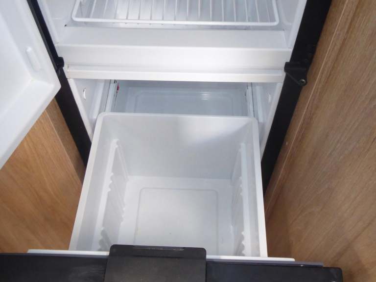 Conveniently adjacent for food storage and preparation is the near side central kitchen, with a gas hob, an oven, and a sink. Opposite is a large fridge with a freezer box.