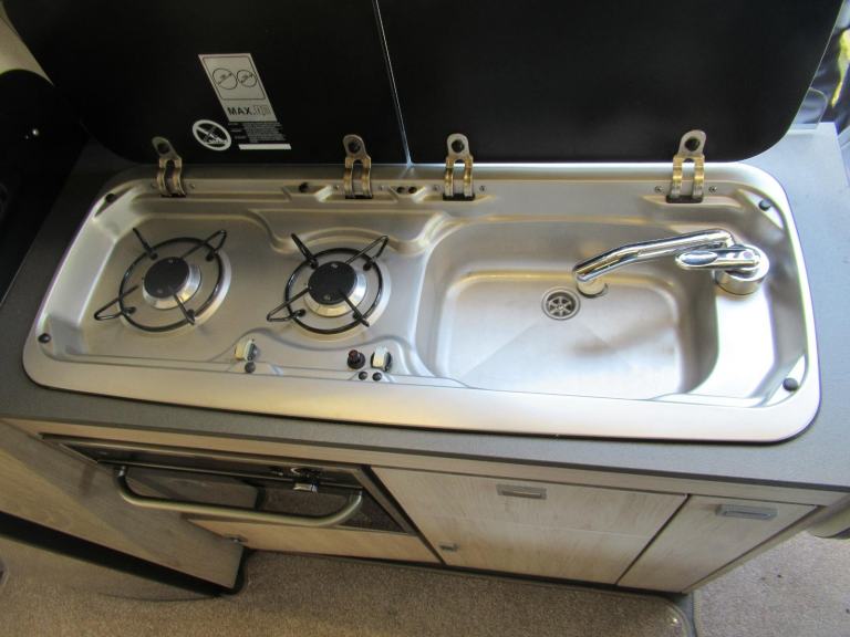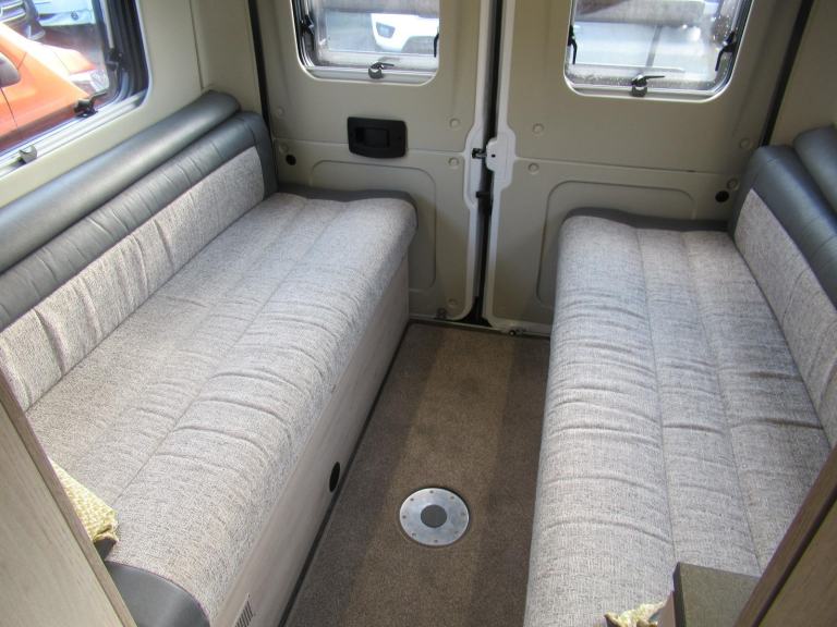 A lovely spacious van with a rear dinette that converts to a large double bed, a mid kitchen and bathroom and a front seating area. There is also the addition of a 2 berth pop top above.