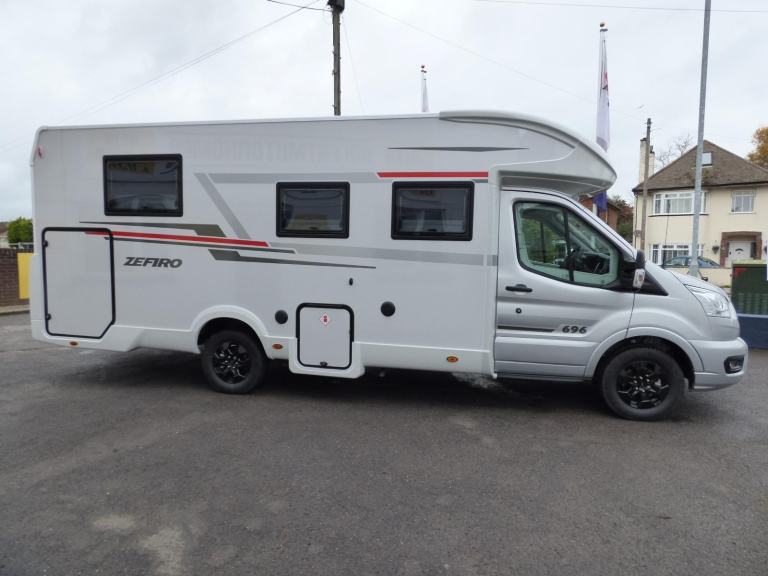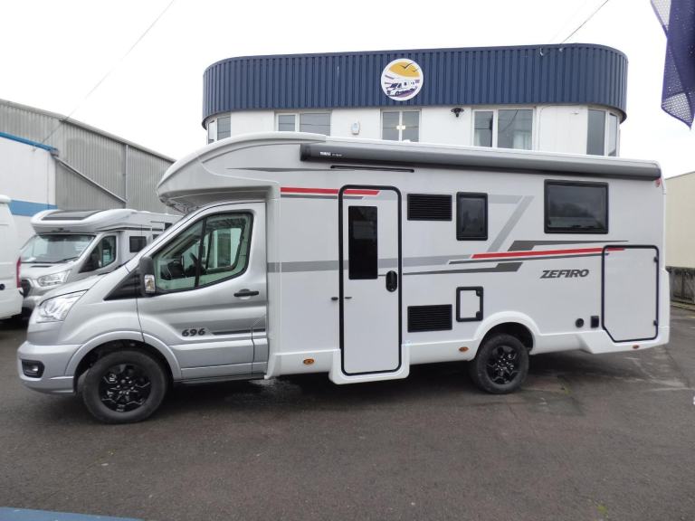 Brand New 2026 Model Zefiro 696 with Driver's Pack in stock Now! Based on the updated Ford Transit chassis with 165bhp engine and 6 speed manual transmission along with the 12" screen Ford infotainment system providing Apple Car Play and Android Auto together with a digital dashboard. The popular layout of rear Island bed with electric elevating bed over the dinette area means it's a great family motorhome sleeping 4. The well equipped kitchen has a gas oven/grill, 3 burner gas hob and fridge/freezer. The mid area bathroom has a separate shower cubicle, cassette type toilet and wash hand basin. Heating and hot water is by Truma combi boiler with iNet X controller. Other features on this Zefiro 696 include: Factory Flex Bed, 200w Solar panel with MPPT Controller, Fiamma bike rack, Thule wind out awning, reversing camera, cab A/C, flyscreens on all windows and habitation door, WiFi, External Shower, BBQ point, carpets and pleated cab blinds. L. 7.45m, W. 2.35m, H 2.95m, 3,500kg, 4 berth, 4 seatbelts. Delivery Miles. Features Include: 200w solar panel with mppt controller, 4g wifi, alloy wheels, bike rack, carpets, external gas bbq point, external shower point, factory flex bed, factory zefiro driver's pack, flyscreen for hab door, front parking sensors, iso fix child seat fixings, pleated cab blinds, rear garage, reversing camera, thule awning, tv bracket, ford 12