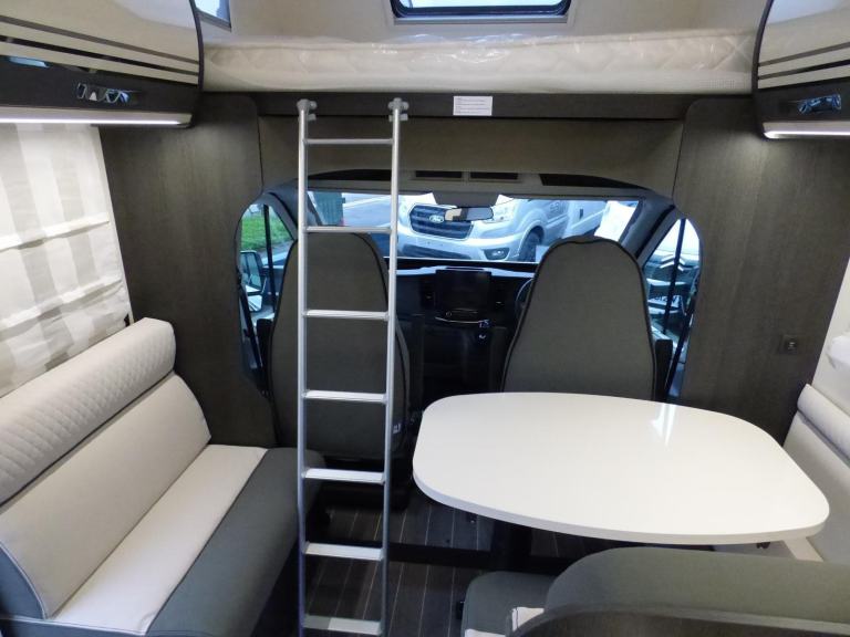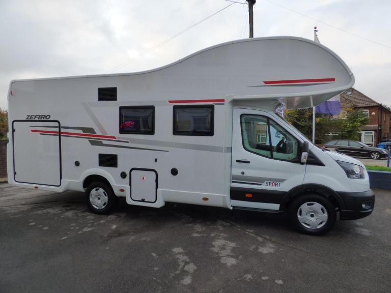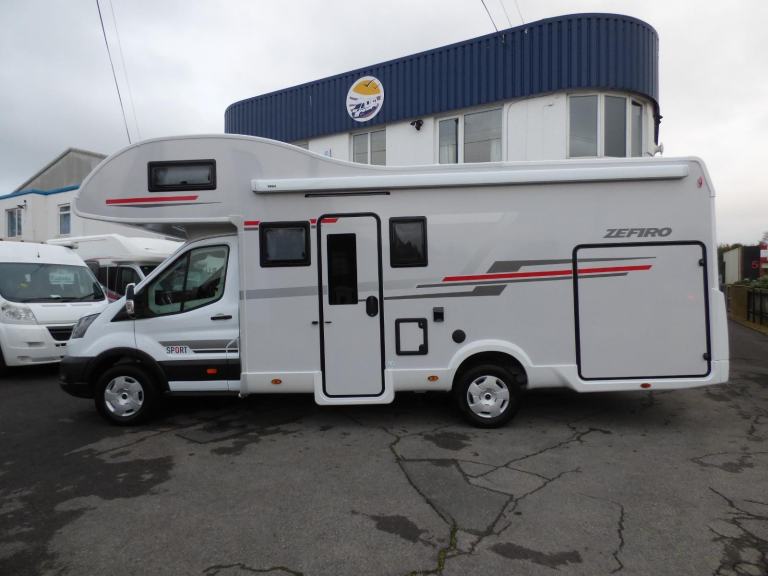 Just Arrived! New 2026 Model Zefiiro Sport based on the Ford Transit chassis with 130bhp engine and 6 speed manual transmission with the Ford 12" screen infotainment system and front parking sensors. The huge rear garage with electric elevating bed over makes this particularly popular for sports orientated users such as Motocross and Karting. The large double bed over the cab and the rear bed mean that four can sleep in comfort and the dinette area has swivelling front seats, so 5 can dine with ease. The well equipped kitchen features a 3 burner gas hob, gas oven/grill and large fridge/freezer with lower bottle compartment. The Zefiro Sport bathroom has a separate shower cubicle and basin with cassette type toilet. The habitation area benefits from a Truma hot water/heating system with the latest Truma iNetX control system, 200w solar panel, LED lighting, TV Bracket, Thule wind out awning, Pleated Cab Blinds, Reversing camera, External BBQ & shower points, 4G WiFi,, ISOfix and carpets. L. 7.43m, W. 2.35m, H 3.2m, 3,500kg, 4 berth/5 seatbelts, Delivery Miles. Features Include: 200w solar panel with mppt controller, 4g wifi, cab a/c, carpets, dinette conversion option, external gas bbq point, external shower point, flyscreen for hab door, ford 12, iso fix child seat fixings, pleated cab blinds, rear garage, reversing camera, thule awning, tv bracket
