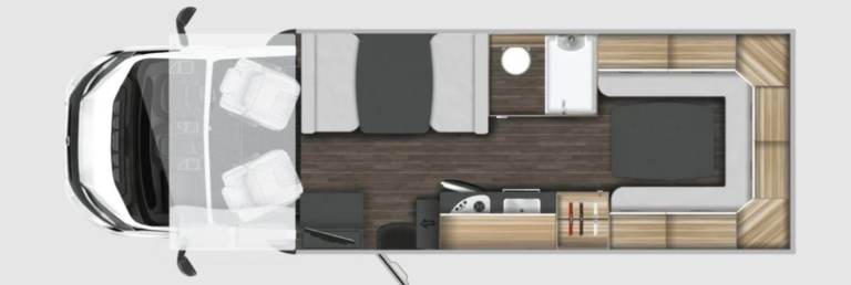 The Rollerteam Autoroller 746 is a rear lounge layout (which converts into a double bed), with mid-van kitchen and washroom, front double dinette and overhead cab bed which is accessed via a ladder.