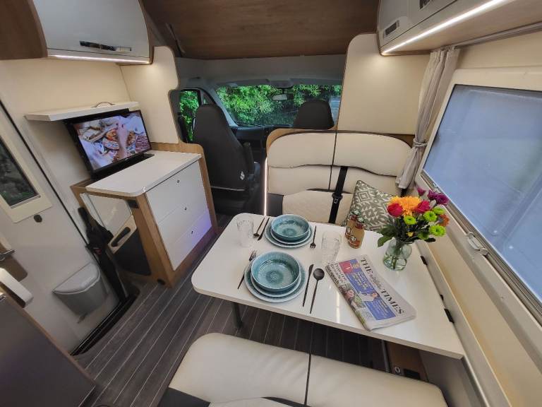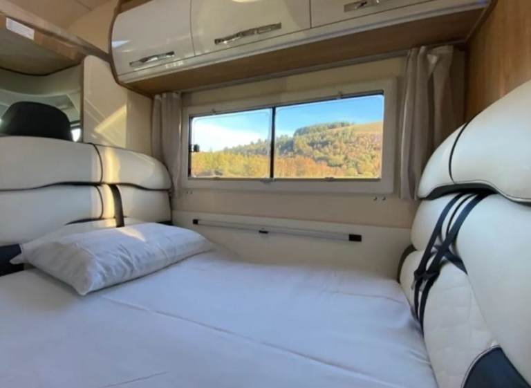 The front dinette converts into a 1.80m x 1.25m double bed whilst the overhead cab bed measures in at 2.10m x 1.55m.