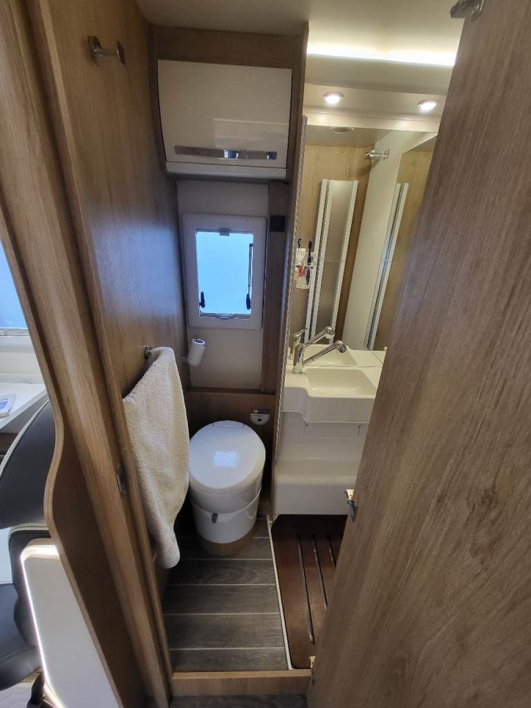 The washroom opposite the kitchen boasts a Thetford Cassette Toilet with electric flush, wash basin and shower.