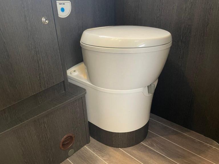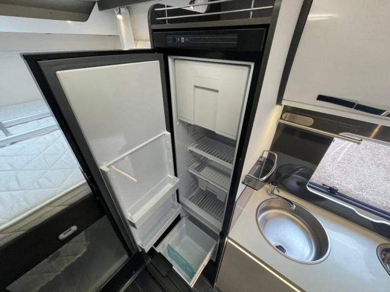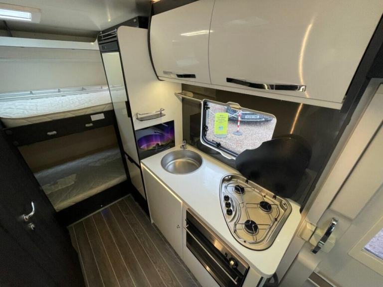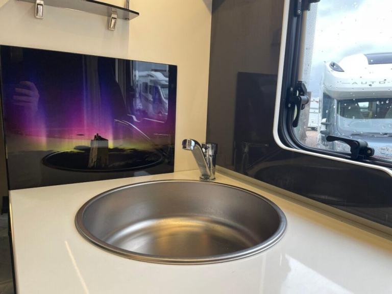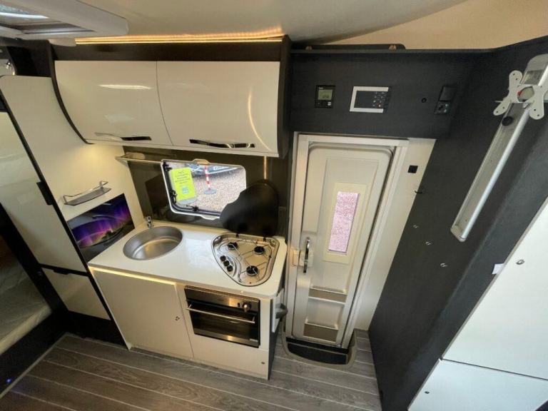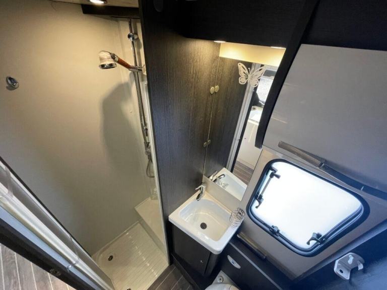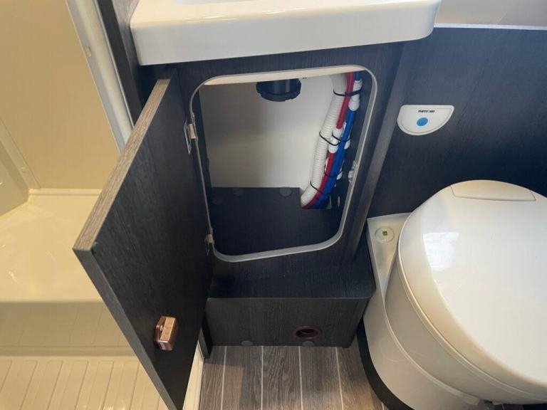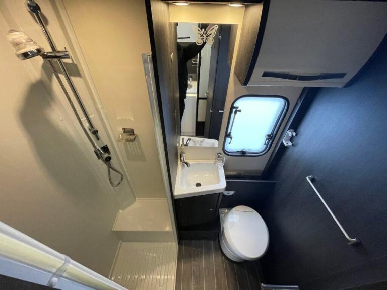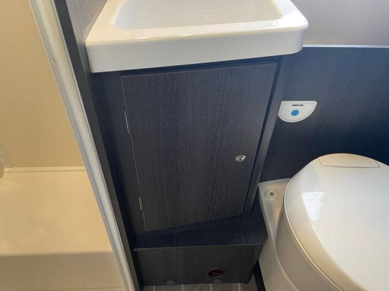 In the centre of this motorhome you have a centre washroom and kitchen which have been uniquely designed to optimise space and luxury. In the washroom you will notice they have made it so you have a completely separate shower cubicle. Not only does this mean you will no longer be required to clean the entirety of the washroom after each shower but it also means you can get a nice wooden modern flooring around your cassette toilet creating two spaces. The toilette is a cassette swivel one so you can point this in the favoured direction to optimise leg room. You also have a full vanity basin unit providing a great place to store all of your bathroom essentials.