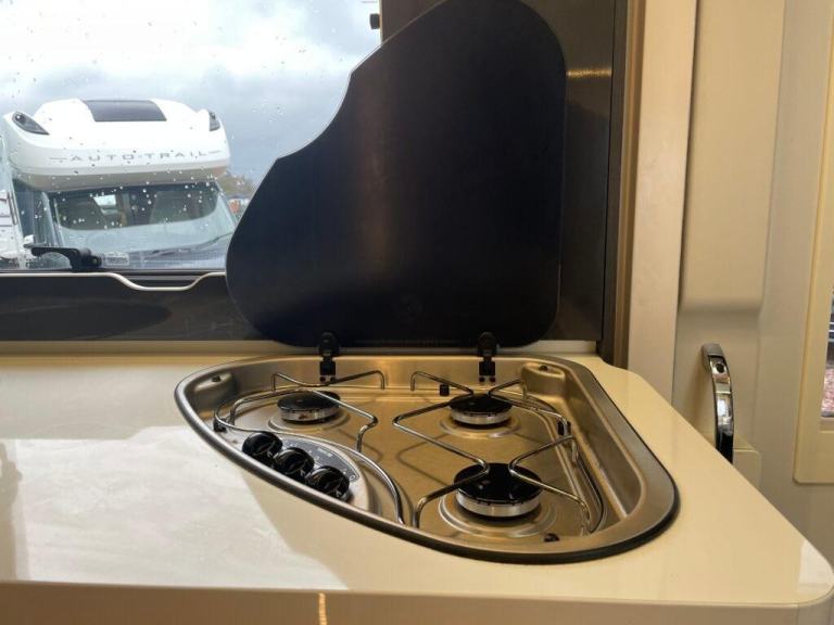 On the alternate side of the motorhome you have your centre kitchen which houses the following appliances; Thetford Oven/Grill, Underunit LED lighting, 3 Ring Gas Hob, Sink, 3 Way Fridge, Storage Cupboards and Storage Draws. The kitchen also has a large opening window to help with ventilation and also to brighten the space with daylight saving the need to run your lights all day.
