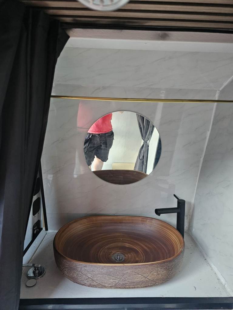 Luxury End Bathroom: Full-size shower, compost toilet, and large ceramic wash basin.