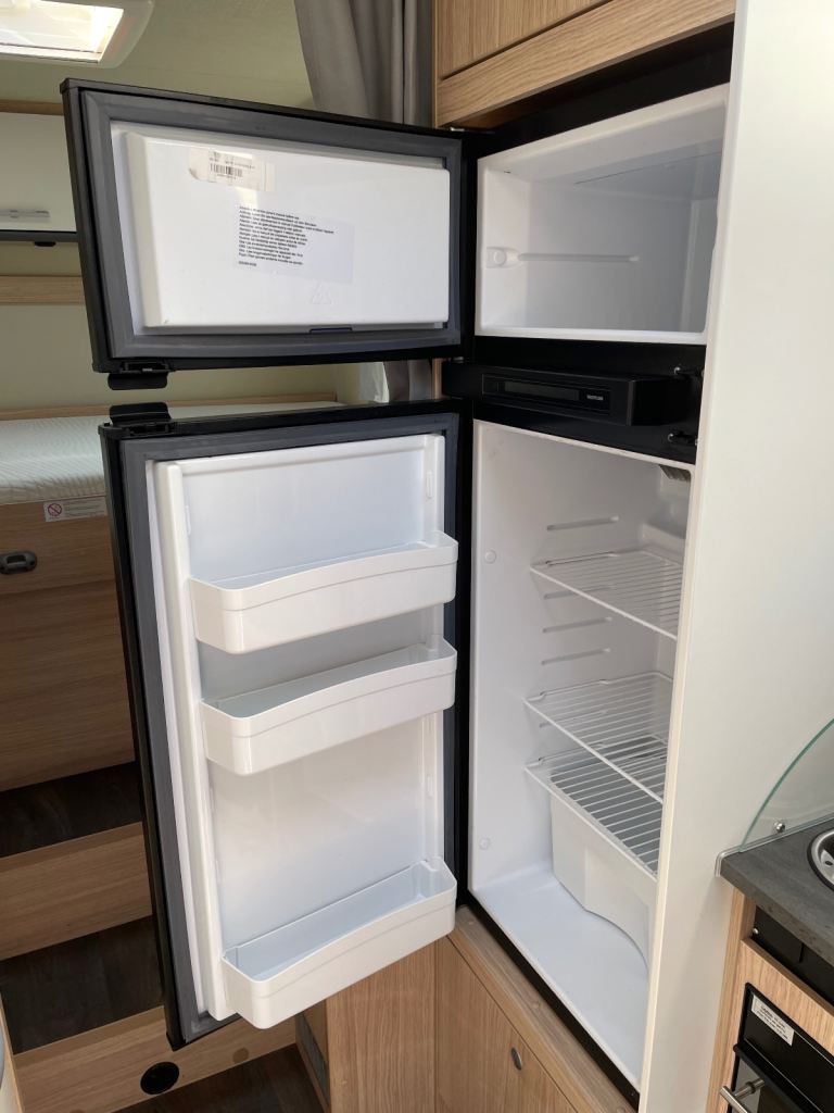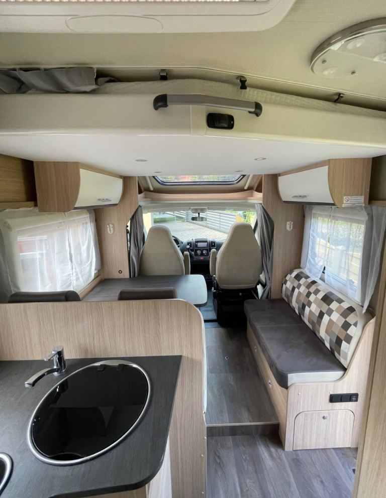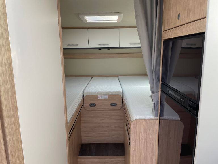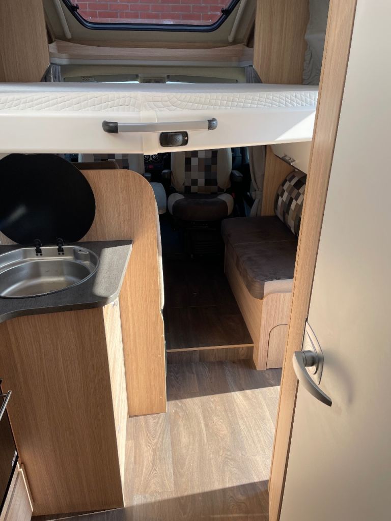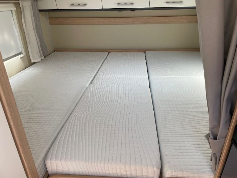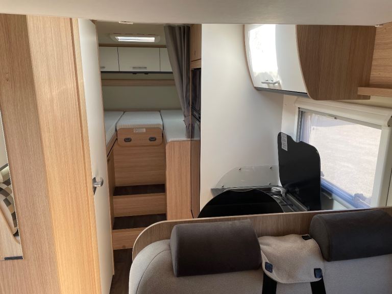 Large rear bed with a drop-down bed at the front. Also a very large fridge and freezer. And a well equipped kitchen area. The motorhome is a.