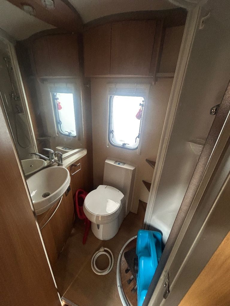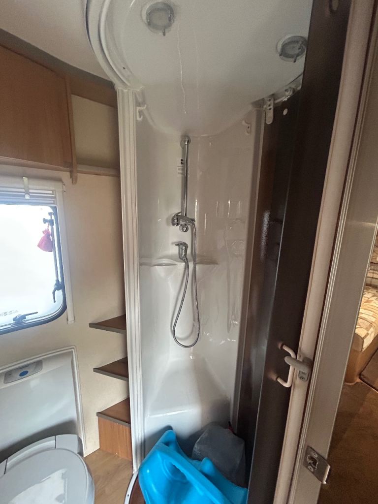 The fully equipped kitchen includes a gas hob, oven, grill, microwave, and fridge with freezer, giving you everything needed for extended trips. Opposite, the washroom features a separate shower cubicle, toilet, and sink for added convenience.
