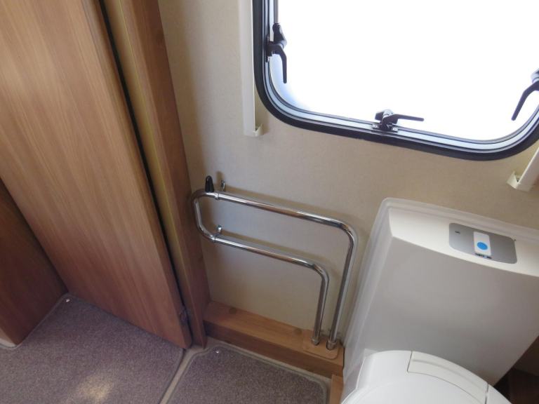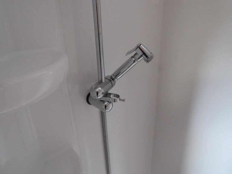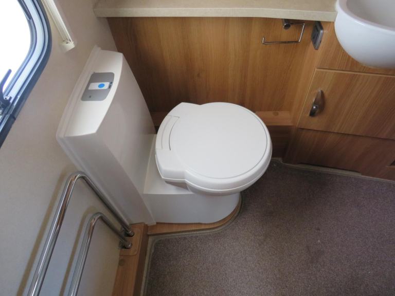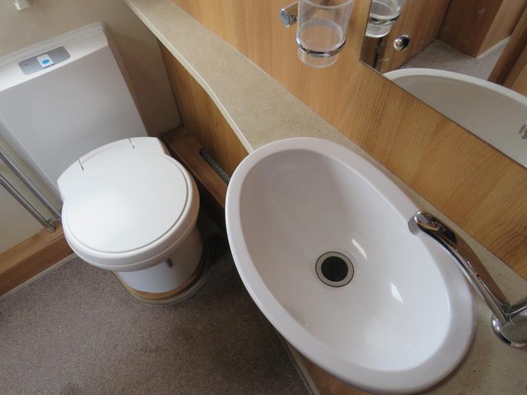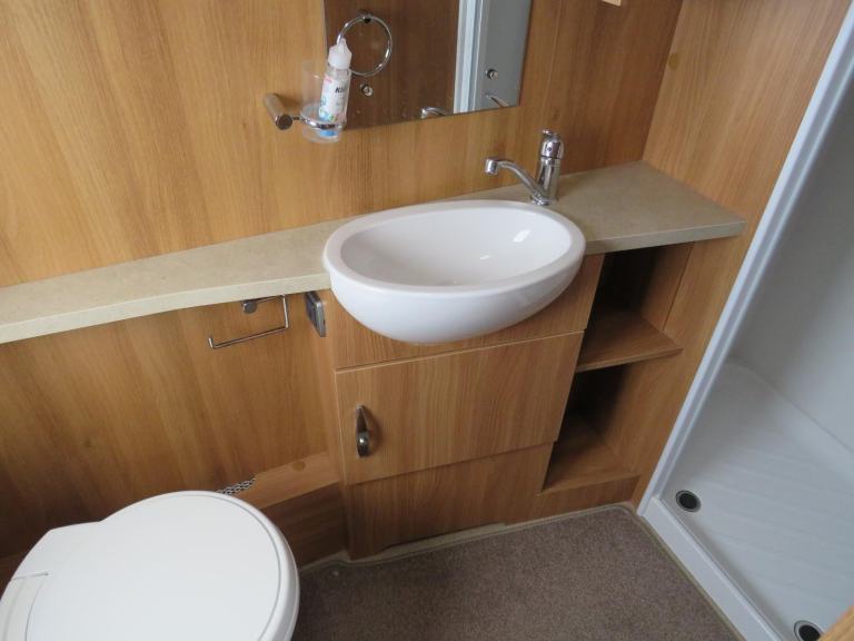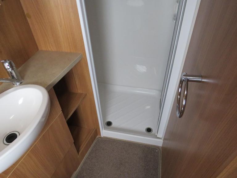 At the back is the full sized end bathroom, with electric flush cassette toilet, sink with vanity unit and separate shower cubicle.