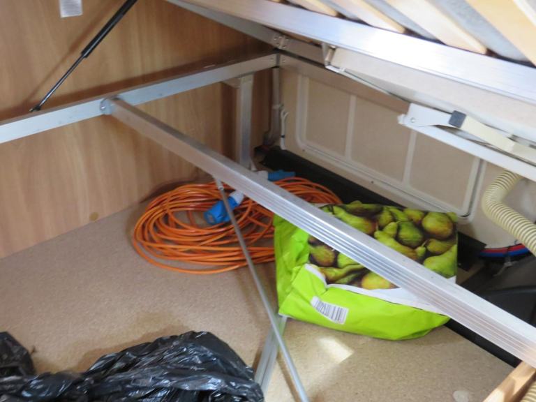 Behind the kitchen is the bedroom area featuring a fixed double french style bed, underneath can be used as a large storage area.