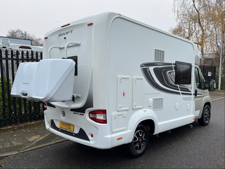 We are very pleased to present this well designed, spacious Swift Champagne 604C. Automatic transmission, 3500kg, built on the Fiat Ducato chassis | Under 6m length with Automatic transmission, this is a perfect balance of luxury, practicality and modern design | Kitchen with gas hob, microwave, oven, grill, fridge & freezer, sink, extending worktop | Spacious & sociable seating and dining area | Driver & passenger seats swivel to give additional seating | Well-designed washroom with sink, wc, mirrored cabinet and separate full shower enclosure | Electric drop down double bed | Additional fold-down double bed | Good range of storage | 4-berth / 4-belt | TV with DVD | Aerial | Fitted with Swift Command Thatcham Cat7 tracker | Fiat factory fitted electronic alarm | Truma combi system heating & hot water | Reversing camera | Fiat U-Connect media system with SatNav & bluetooth phone connection | Cab air-conditioning | Solar panel | Awning | BBQ point | External shower point | Gas bottle | Alloy wheels | Carry-All rear storage box | Euro 6 compliant 2.3 diesel engine | For additional photos for this lovely motorhome, further information or to arrange a viewing contact Julian on [Phone number removed]. Please note, this vehicle is not a brokerage unit and as such means that it is compliant with the Consumer Rights Act 2015.