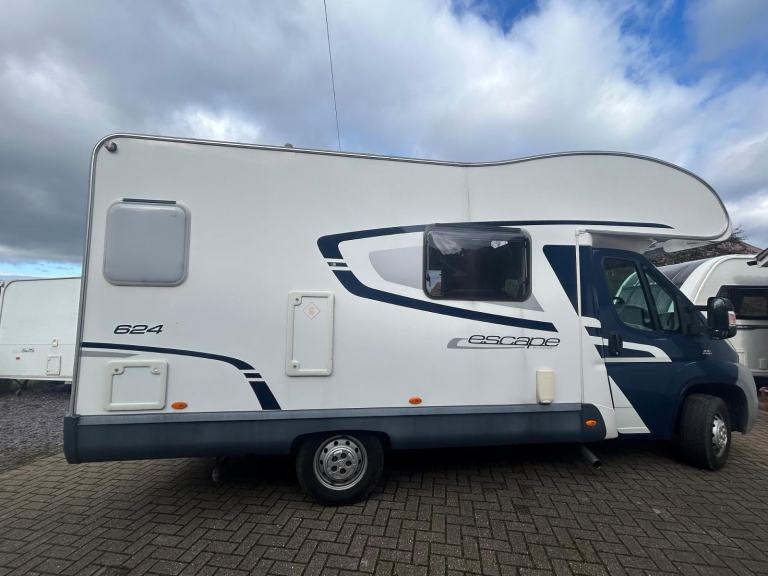 Motorhome Depot are delighted to present to you this coach-built Swift Escape 624.The Swift Escape 624 is a 5 Berth, 4 Seatbelt Highline coach-built motorhome. It is based on the excellent Fiat Ducato chassis with 2.2 Multi-jet 100 Bhp Diesel Engine and a 5 Speed Manual gearbox. The van had a full service in November 2025 so is ready to go.Layout:5 berths including over-cab double.Well equipped end kitchen with, oven, grill, hob, fridge with icebox and sink with mixer tap.Large lounge area with seating for four at a large dining table and an additional side sofa with room for three.Rear washroom with shower, Thetford w/c, mirror, sink and storage cupboard.Bike rack, 4 seatbeltsThe front lounge is really bright & open and consists of a full double dinette with a large dining table, this area easily converts into a double bed, and there is also a large sofa opposite that can be used as a single bed at night. Additionally there is a large double bed over the cab . The rear kitchen benefits from a sink, 3-way fridge with freezer compartment, gas oven/grill and three-burner gas hob. The rear corner washroom has a Thetford electric flush cassette toilet, sink, central shower tray, rooflight with Flyscreen and storage cupboard & large mirror.The Habitation check was done in February 2026. Dimensions: Length – 6.30m, width with mirrors folded – 2.24mheight – 2.94m, MTPLM – 3300k, There is a little damage at the rear that would need some attention, the price has been priced accordingly. photos are available on request.