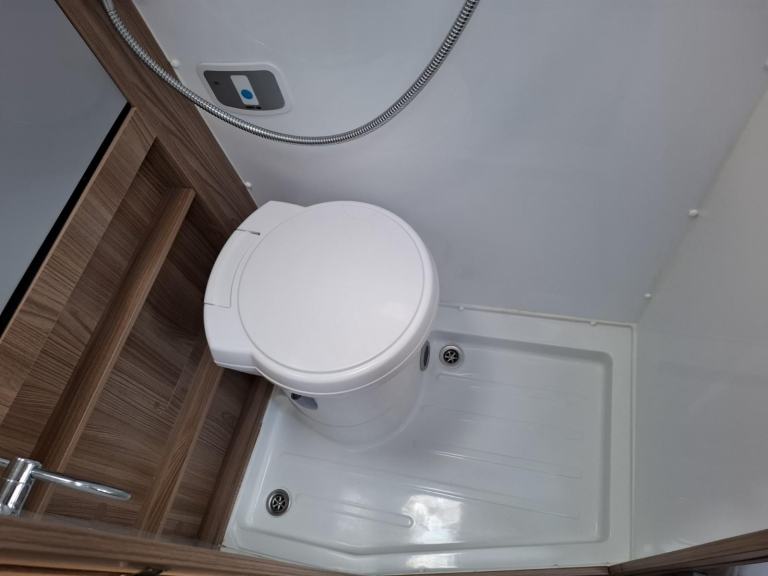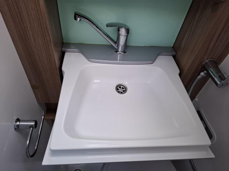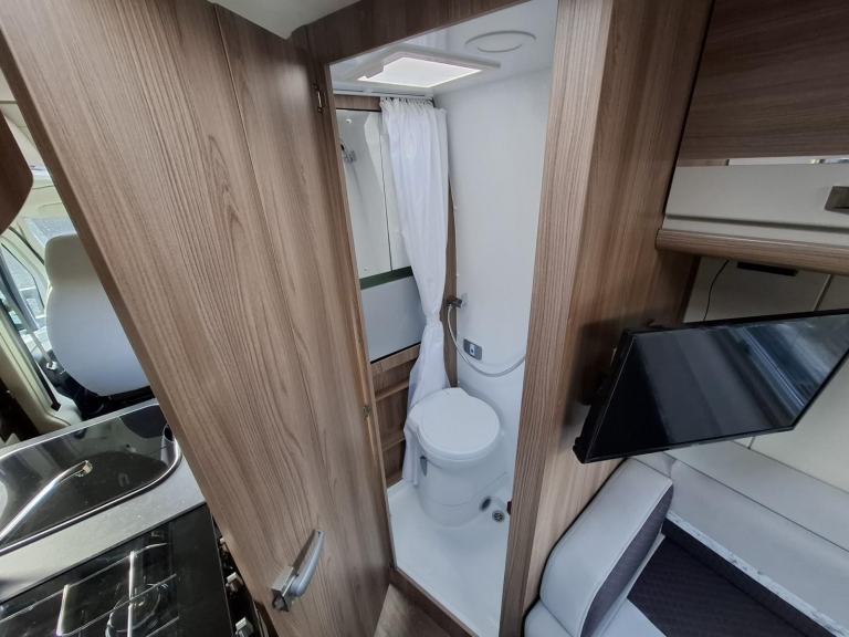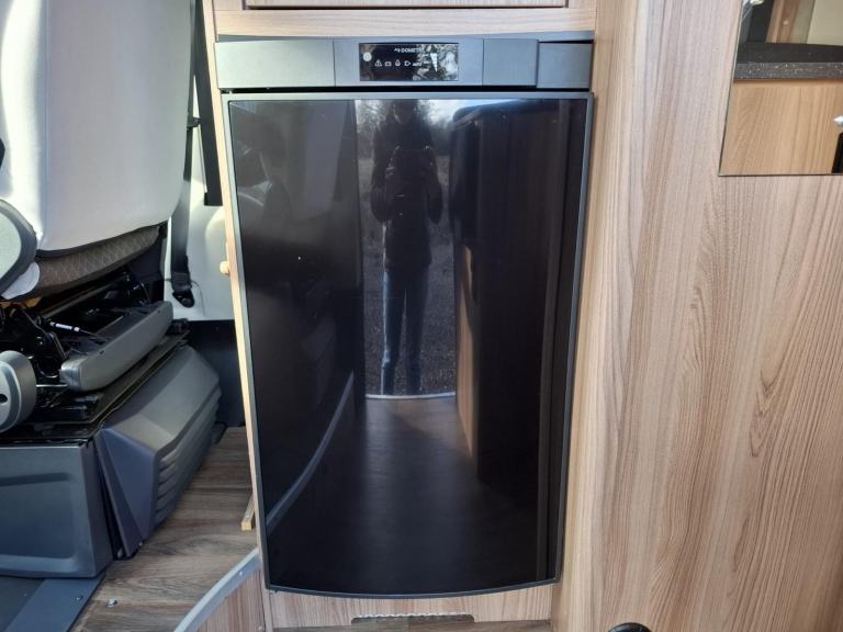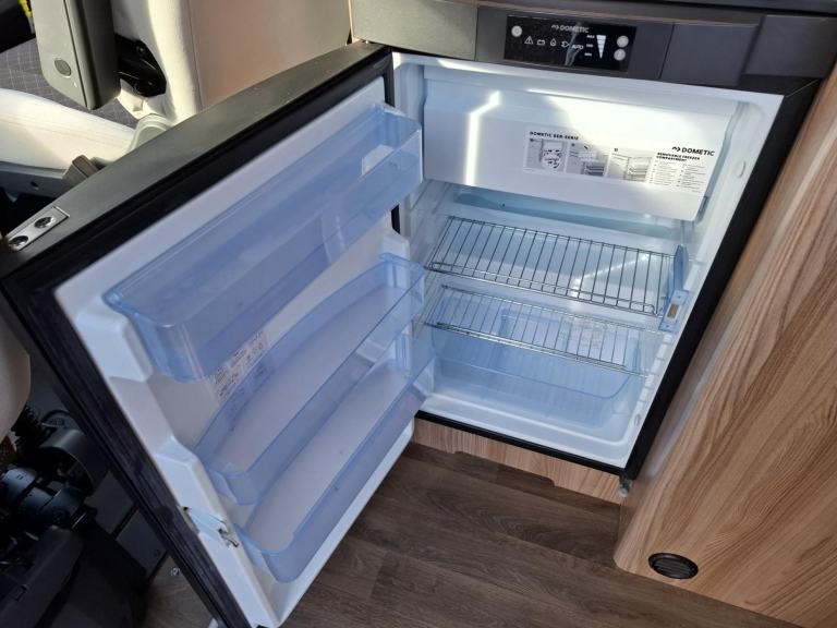 Behind the swivel cab seats on the driver’s side there is a wardrobe above a fridge with a freezer box. This is followed by the wet room, with a toilet, fold down hand basin, and shower.