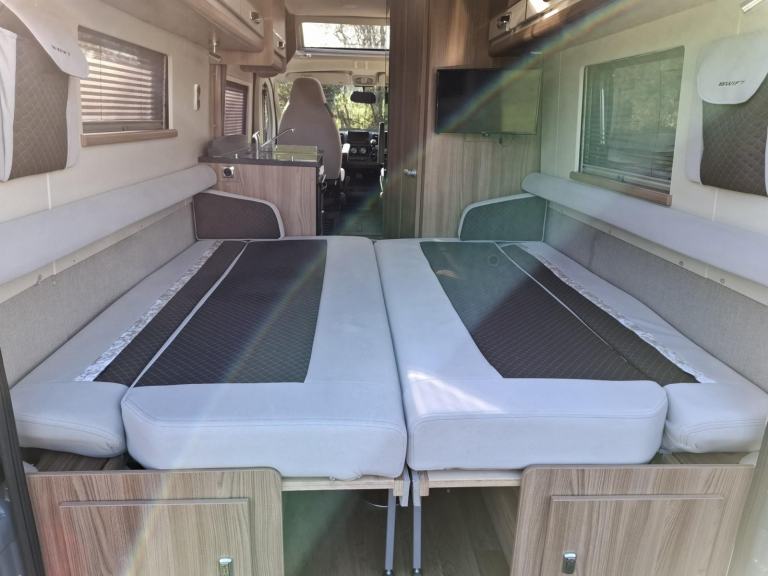 The side sofas can be used as two single beds 186cm (L) x 66cm (W), or quickly converted into a large transverse double berth (195cm (L) x 186cm (W).