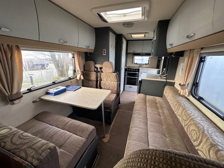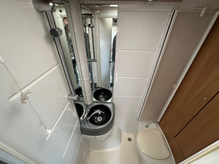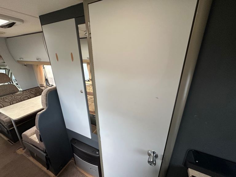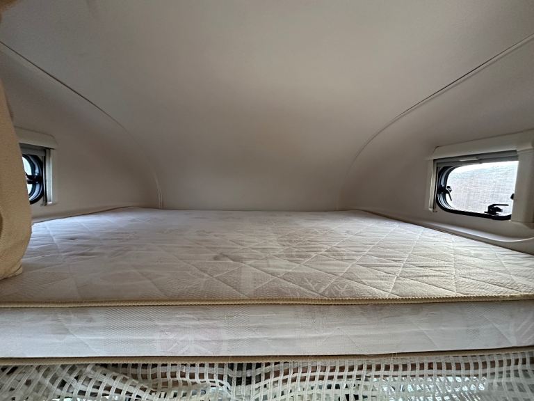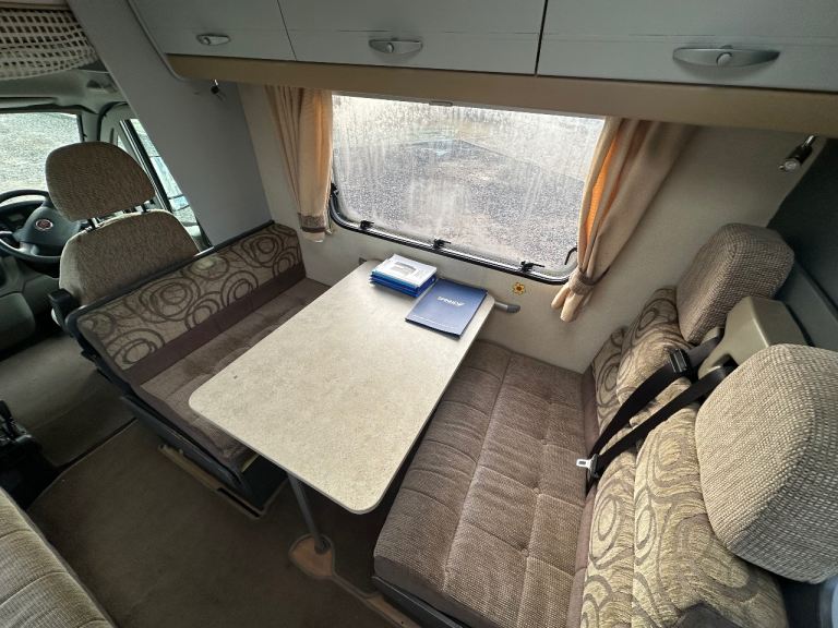 WITH KING BED OVER CAB SIDE DINETTE WHICH CREATES A GREAT SOCIAL AREA & CONVERTS TO ANOTHER DOUBLE BED LONG SEAT OPPOSITE WHICH COULD BE USED FOR A SINGLE BED KITCHEN HAS OVEN HOB SINK FRIDGE FREEZER SIDE WASHROOM WITH SINK SHOWER CASSETTE TOILET