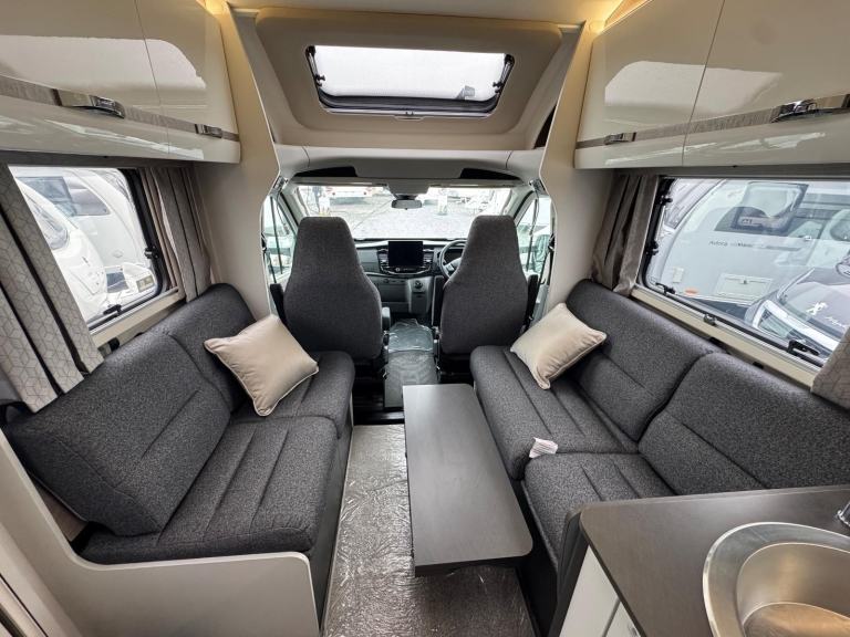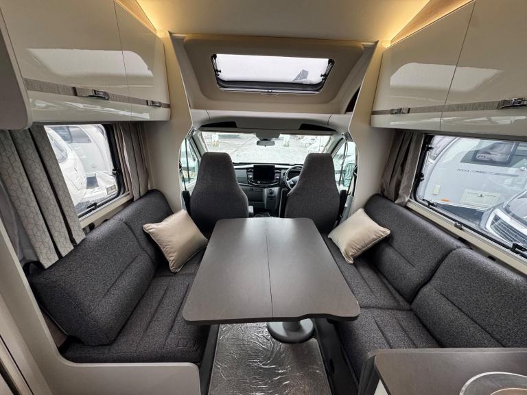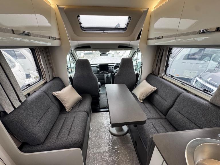 The 584 adopts a floor plan which allows for a garage below , a popular layout , together with a level of equipment you would expect as standard. The magnetic grey cab blends well with the white bodywork and there is tasteful decor and soft furnishings throughout . A spacious lounge / dining area is enhanced with swivel cab seats to join inward facing seating around a fixed pedestal table. The table has manual for and aft electric height adjustment.