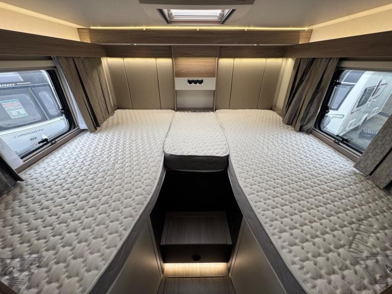 Fixed twin beds in a full raised rear bedroom with twin wardrobes - offside shower cubicle - nearside washroom with vanity unit - central offside kitchen - nearside tower fridge - 2 bench settees / double bed / dinette are at the front - swivel cab seats