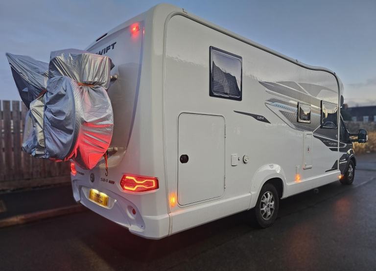 Located in Hull. Viewings are by appointment only. Part exchange, finance and warranty options are avaliable. 31 free drive away insurance provided upon purchase.This 2022 Swift Voyager 584 is a luxury 4 berth, low profile motorhome with just 6,500 miles on the clock. Built on a Ford Transit chassis with a 2.0L EcoBlue diesel engine and 6 speed manual transmission, it’s a high spec model that blends practicality with comfort. At 7.8 metres in length and with a maximum weight of 3,500kg, it’s suitable to drive on a standard licence. The vehicle has had two owners from new and comes with full service & habitation history and a valid MOT until November 2026. It’s been stored under cover when not in use and is in superb condition throughout.This layout offers four belted seats and four berths, with twin fixed single beds to the rear fitted with premium Duvalay Duvalite Alto mattresses, and a front lounge that converts into a comfortable double. The front back two extra Aguti travel seats include ISOFIX. The lounge area benefits from upgraded soft furnishings, a large skylight, and a drop in dining table. Twin TVs are fitted one in the bedroom and one up front.The central kitchen features a Thetford Triplex combination oven and grill, 3 burner hob with electric hotplate, and a High standing Dometic fridge, while the washroom offers a separate Ecocamel Jetstorm shower, cassette toilet and full height vanity mirror. Heating and hot water are supplied by a Truma CombiNeo dual fuel system, and a workshop fitted Truma Aventa habitation air conditioning unit is installed overhead.Externally, There’s a large heated rear garage with lighting, USB, 230V power sockets, and twin access doors, outside there is also a canopy, BBQ point, alloy wheels with TPMS, reversing camera, solar panel, and a bike rack. The van is also equipped with a built in WiFi.Up front is a 12-inch touchscreen, Apple CarPlay/Android Auto, DAB radio, and multifunction steering wheel. The cab is air conditioned, with electric windows and mirrors, cruise control, and heated windscreen.