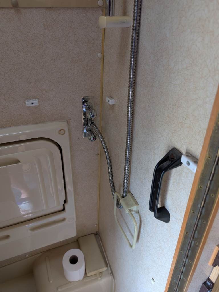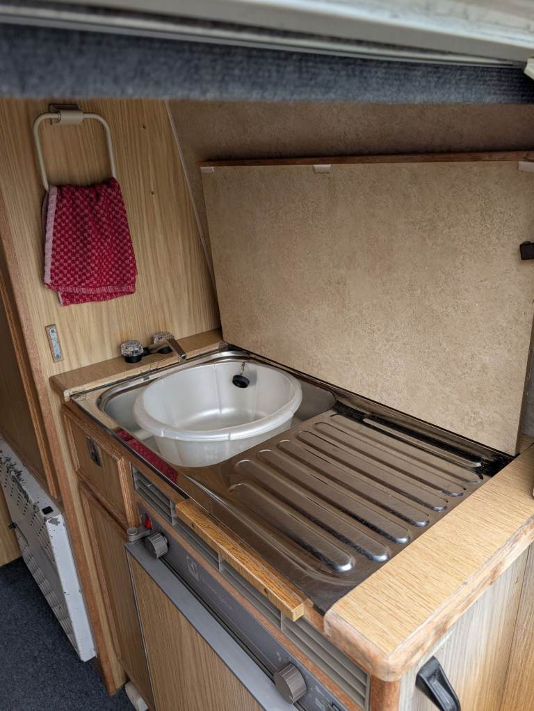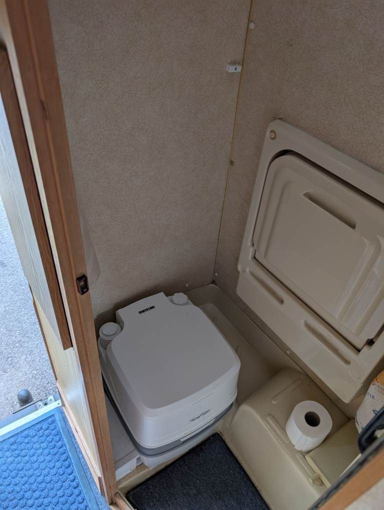 There is an electric/gas fridge with freezer compartment and a gas oven/grill. The bathroom has a porta potti and heated shower, although I am yet to use this or the gas fire but I am assured by the previous owner that they both work. So far I have only visited sites with electric hook-up, so I have used their shower facilities. No need for any heating as yet as the camper is very well insulated.