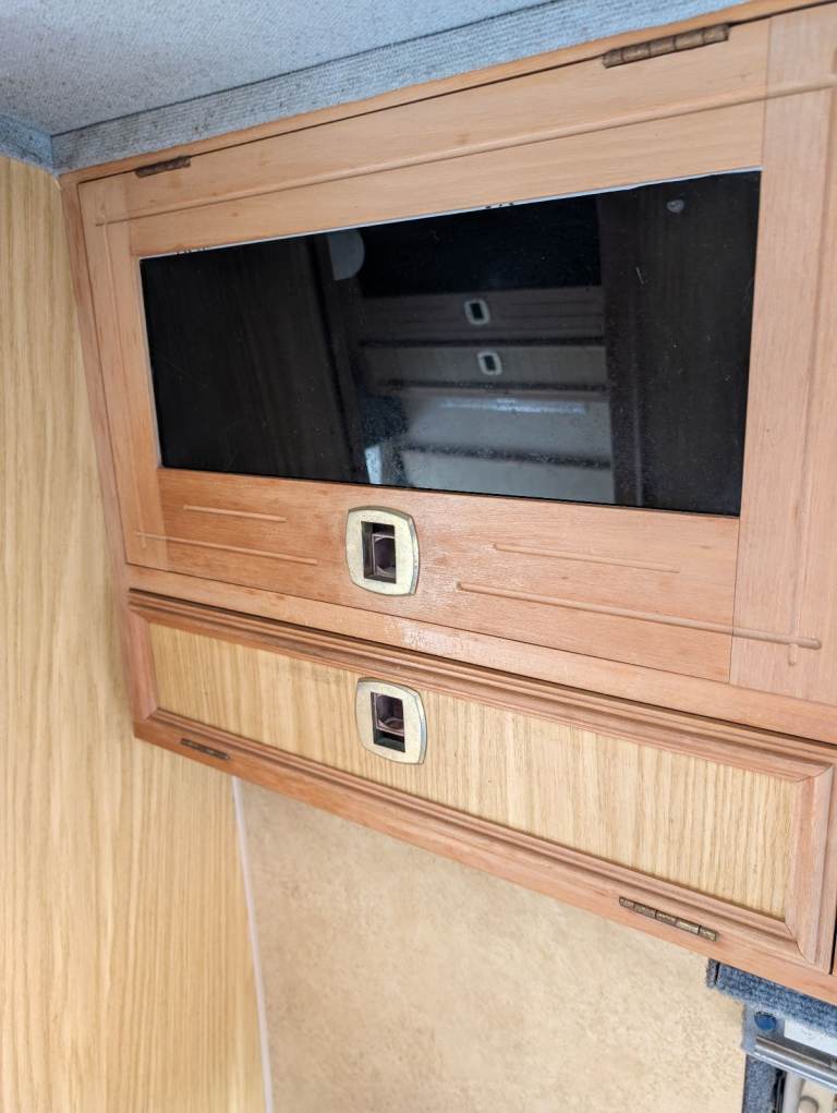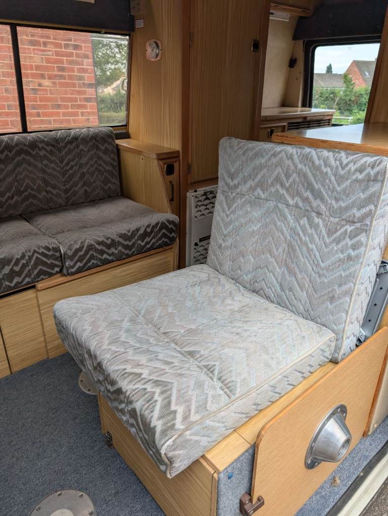 It has an awning on the side, tow bar, two gas bottles and various levelling wedges etc. It has a large wardrobe, and lots of storage under the seats. Configuration shows one sofa and one single seat but the vehicle can convert into two singles or two sofas. Both front seats revolve 180 degrees to form part of the two single or one double bed.