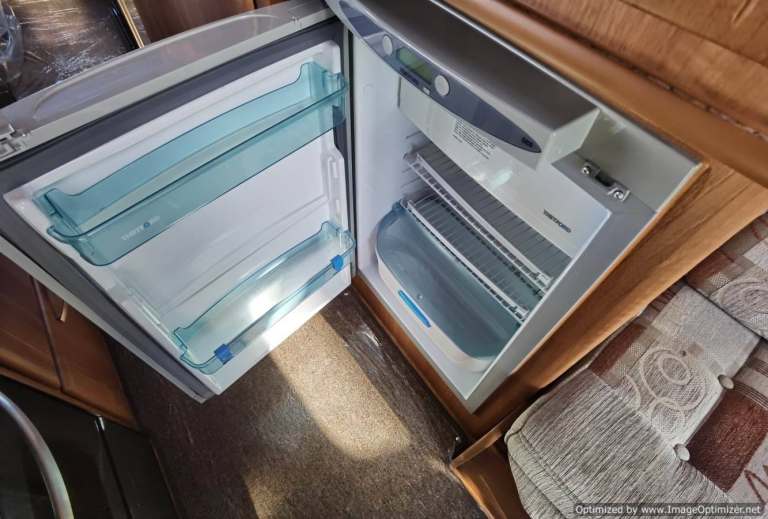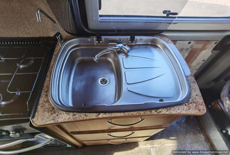 Neatly designed kitchen area has all you need on board with full cooker, hob, sink, fridge, storage and glass appliance covers