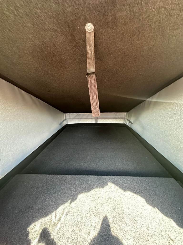 Really practical layout with rare dual swivel front seats so everyone can sit facing each other, and the fridge remains accessible even when the bed is down.
