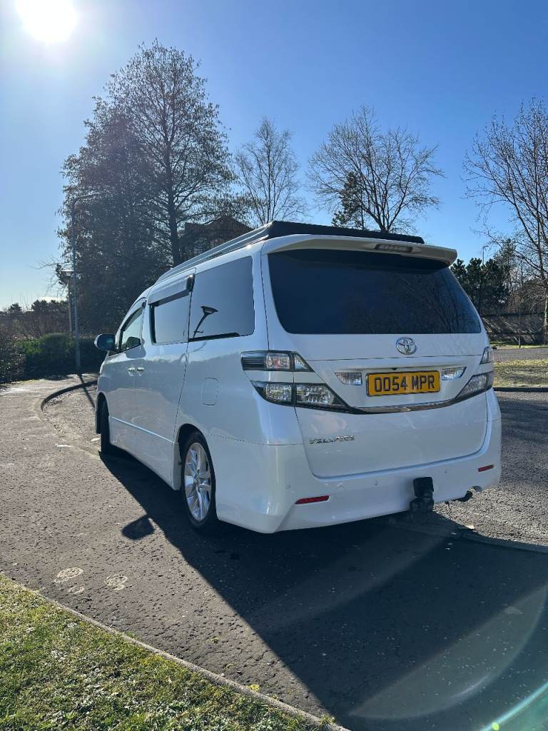 Beautiful Pearl White Toyota Vellfire with a brand new professional side camper conversion, not yet used for camping. Sleeps 4 with 2 on the rock & roll bed and 2 in the pop-top roof bed.