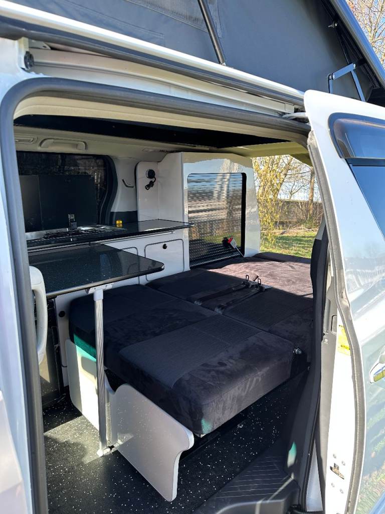 Spec includes pop-top roof, fridge/freezer, hob & sink, leisure battery, 230v hook-up, solar panel, USB charging, folding table, fresh water system, Apple CarPlay and reversing camera.