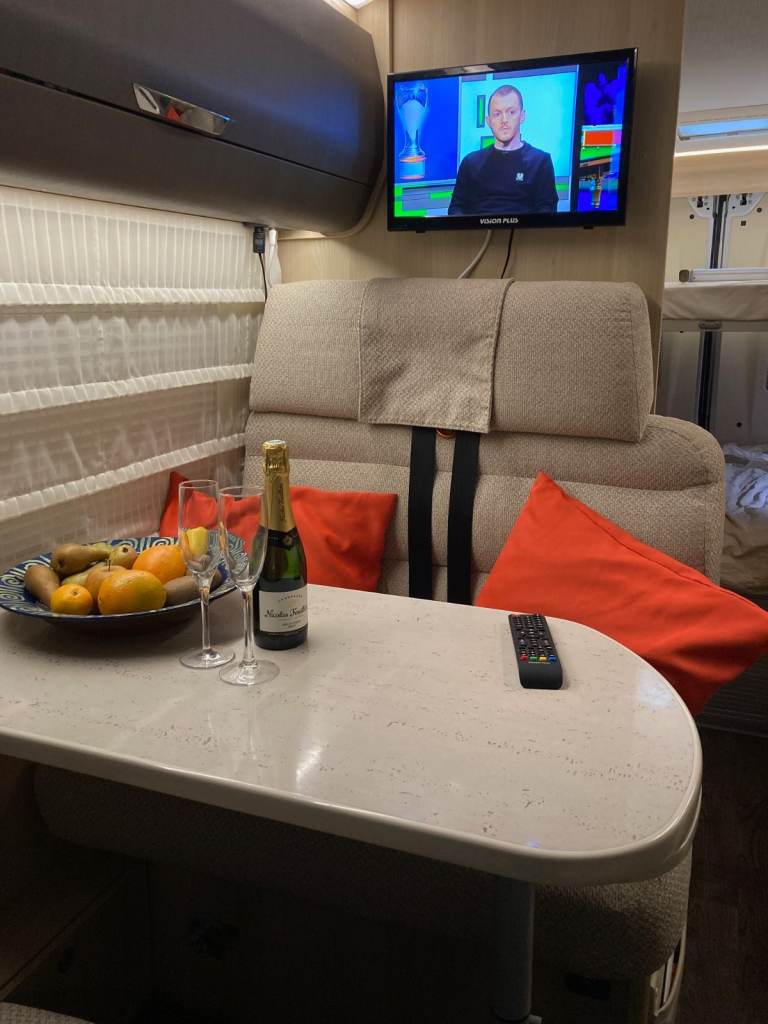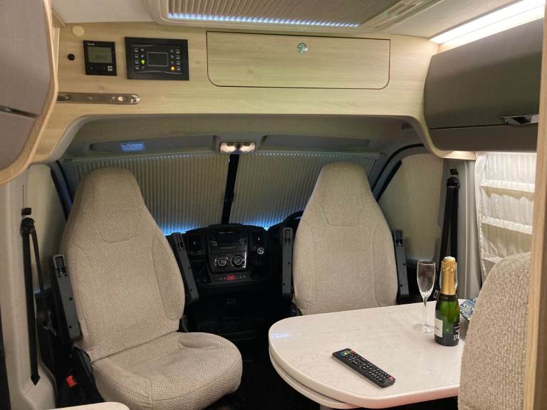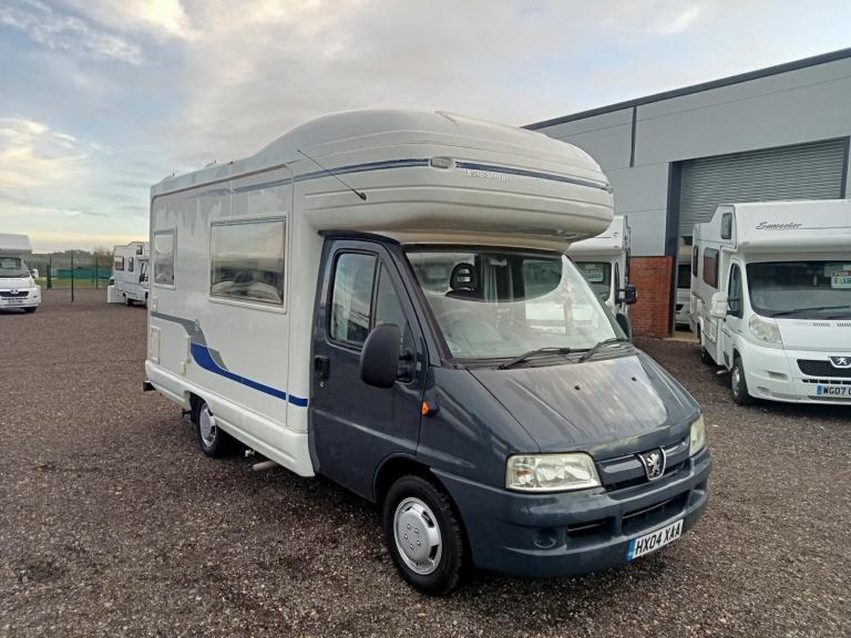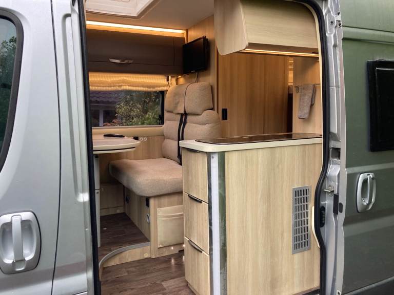 Trigano Tribute 669, four-berth campervan for sale. Fully equipped for touring with, flush toilet, shower and kitchen. Hot and Cold water and heating.