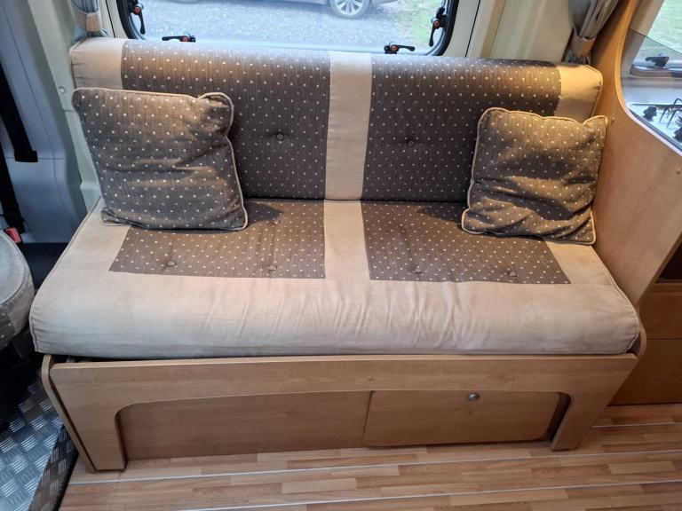 This campervan features a broad, comfortable sofa opposite the side door, and, on the nearside, a forward facing seat. The forward habitation can be enhanced as a leisure/dining area by the use of the swivel cab seats. The seating can be combined to form a transverse double bed, or used as two single berths.