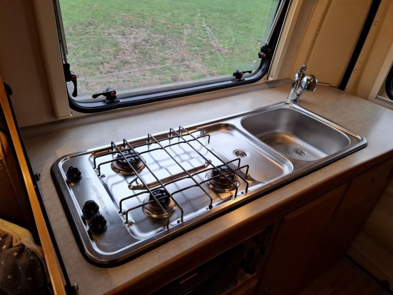The offside rear of the vehicle is home to a kitchen with a 3-burner gas hob, an integrated stainless steel sink and drainer, an additional fold down preparation surface, a grill, and a fridge with a freezer box.