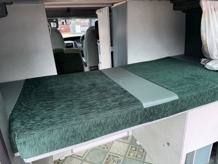 4 Berth: 1 adult on rear fixed transverse bed, 1 adult front seat bed, 2 x children roof bed.