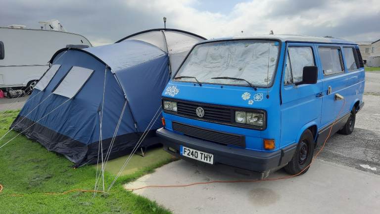 Fantastic T25 VW camper van. Converted import, left hand drive. "IRENE". Recent significant refurbishment of front wheel arches and panels etc. Full width rock and roll bed, buddy seat, fridge, hob, grill and sink. Lots of storage. Includes lots of additional accessories and kit including drive away awning, toilet, electric hook up, wheel brace, steering lock etc. MOT until November 2026, serviced in November 2025. Genuine reason for sale. Would love Irene to go to a good home. Evening and weekend viewings welcome. Lots of other photos available and happy to talk in more detail.