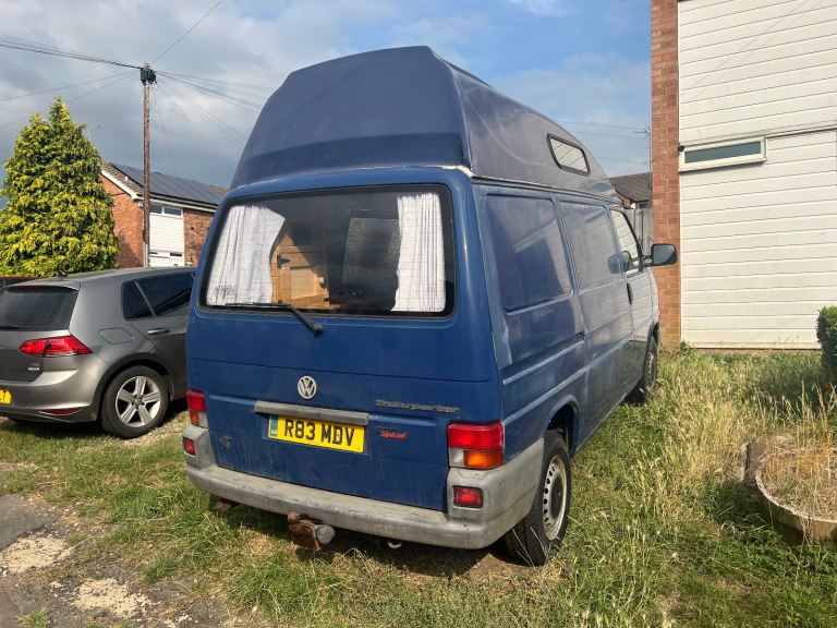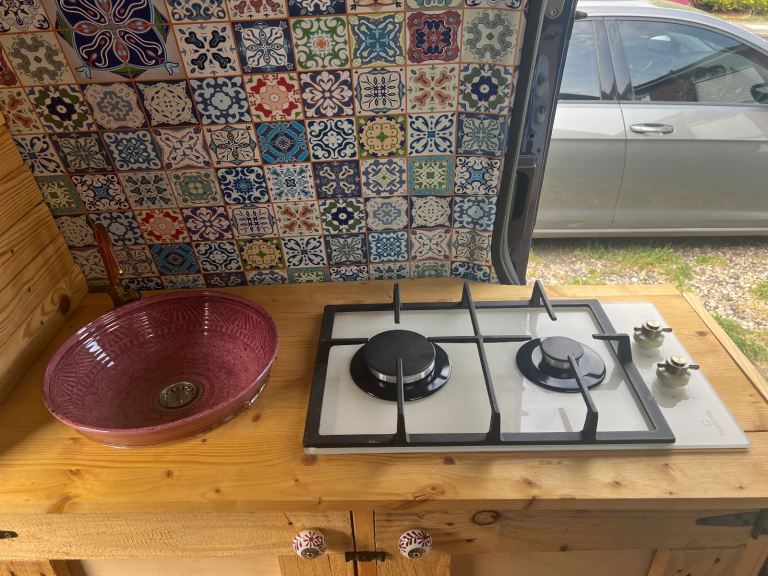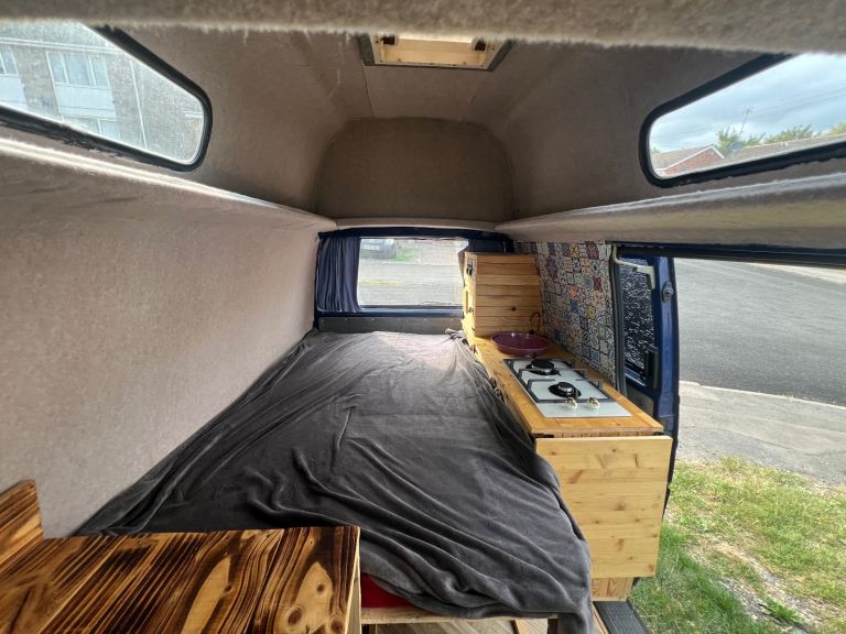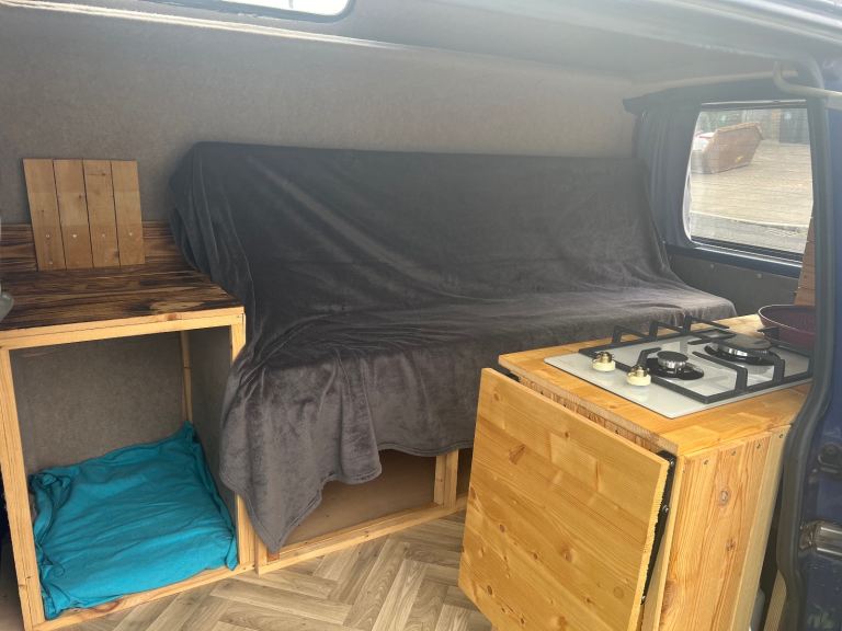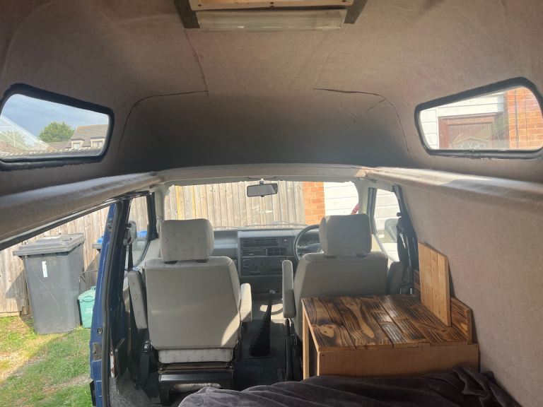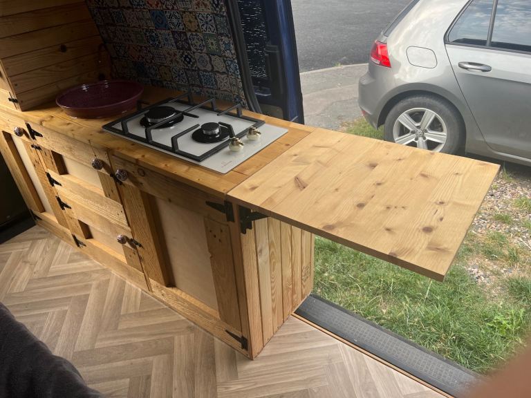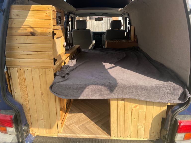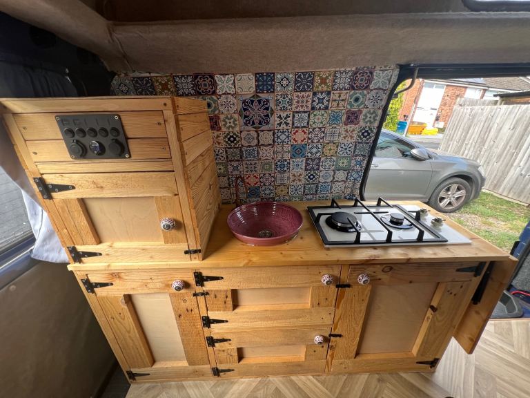 Up for sale is my VW T4 which began it's life as a regular transporter van and then was converted by a previous owner into a campervan with a hightop roof. A new interior for the camper was then custom made last year to bring it up to date and fit my needs when camping with it. This includes a slide out bed, a sink, a twin burner in built stove, plenty of storage in cupboards, above the cabin and under the bed. The leisure battery and electrics attached to this were also updated including a new control panel, which at the moment controls the tap motor and has a 12V cigarette lighter output which I used for a fridge. It also has USB charging ports in the panel.