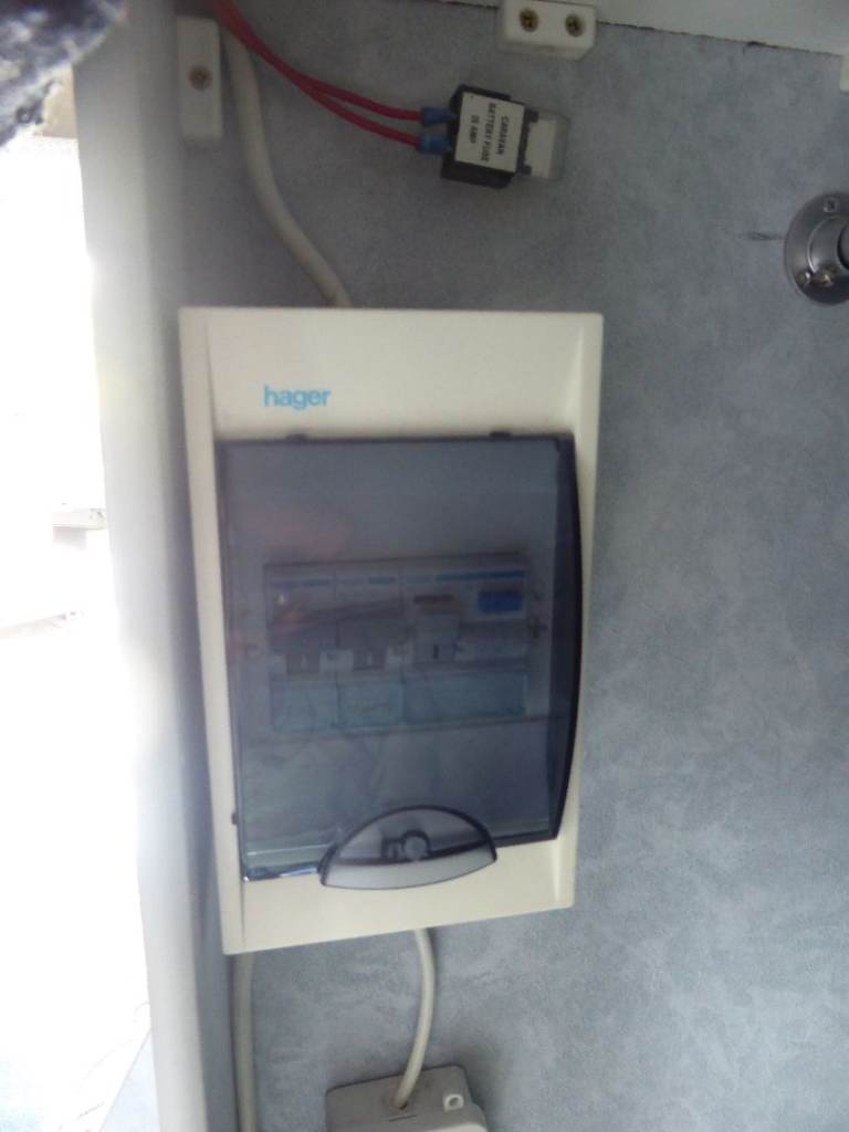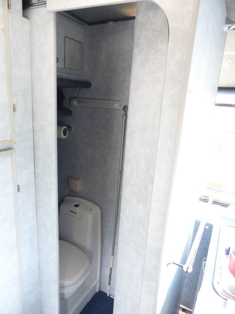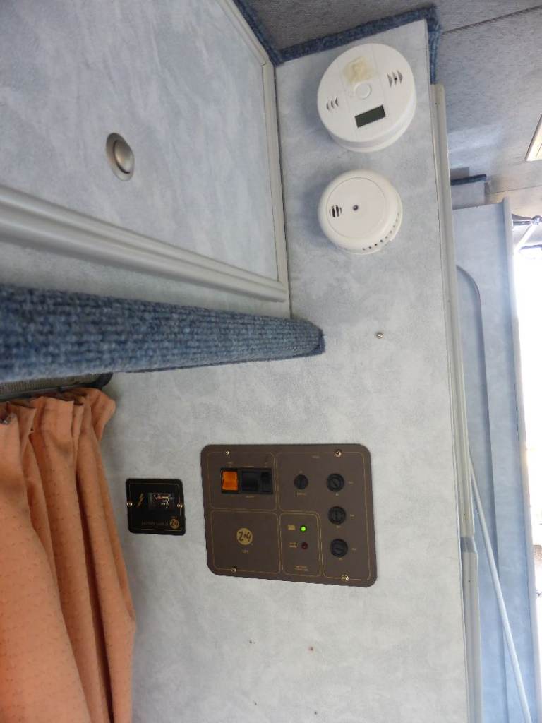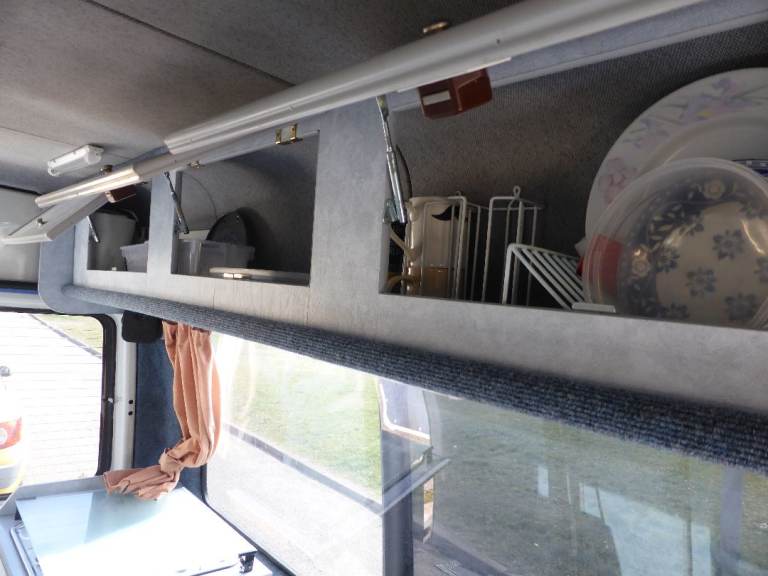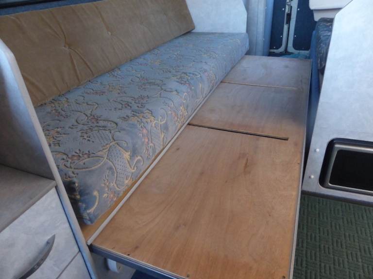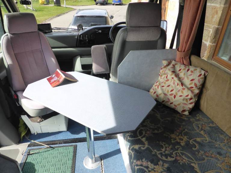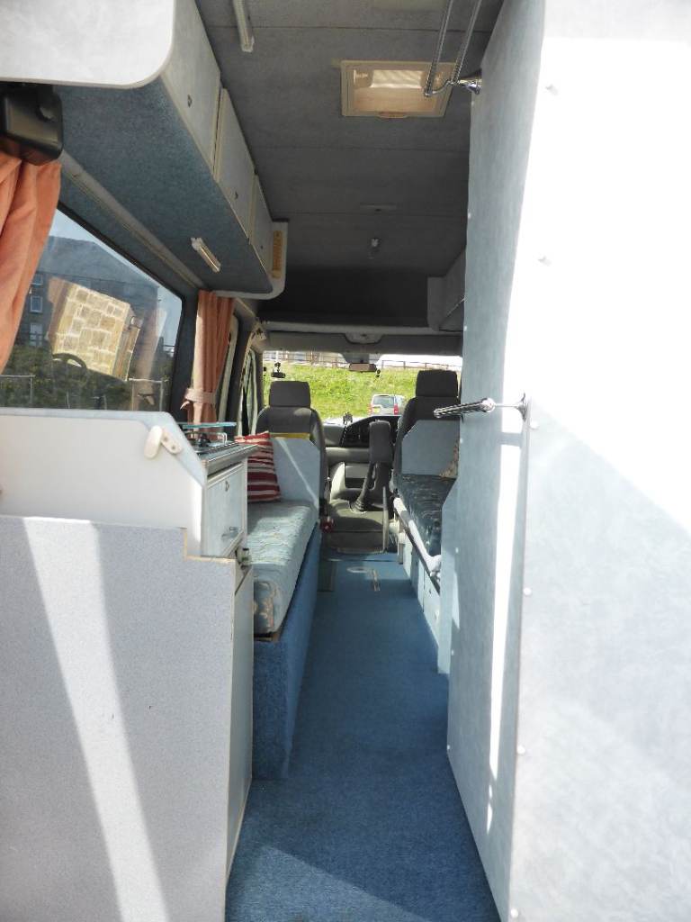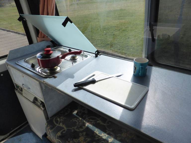 There are two single beds: one bed can be widened with with a pull-out side extension. The fridge works off gas or electricity, there is a sink with pumped water, and a microwave oven. The passenger seat rotates to give seating at the table, and a board fixes beside the sink to give a work surface.