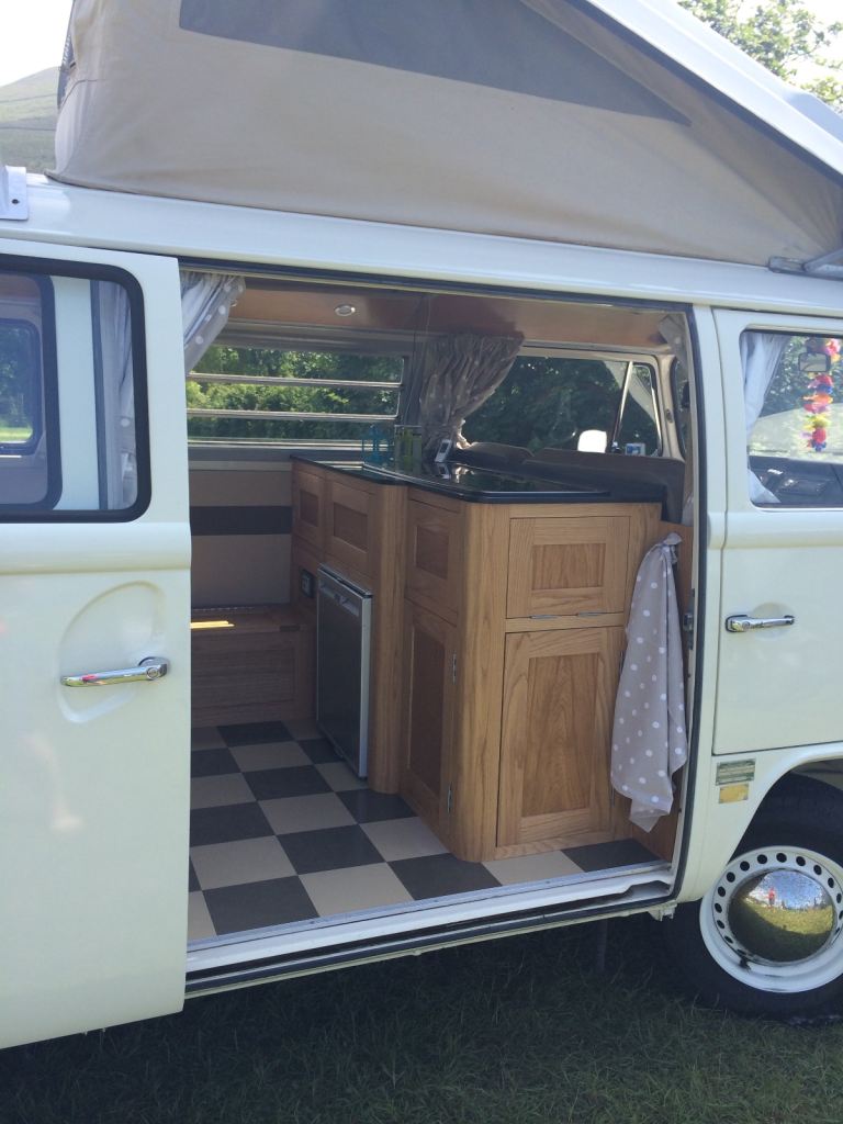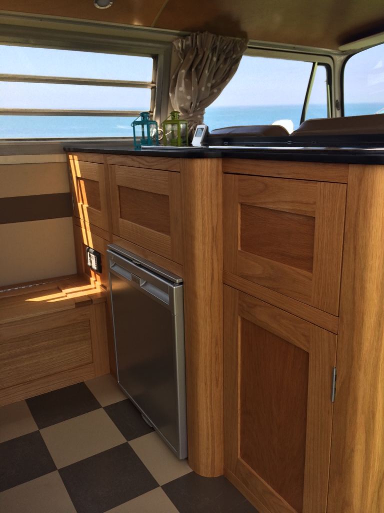 The units are bespoke oak units with black Corian worktop, 2 drawers and loads of storage, electric sockets in worktop, large capacity fridge, sink with large water tank delivered by electric pump, double gas hob, internal lights and spot lights over the bed for reading.