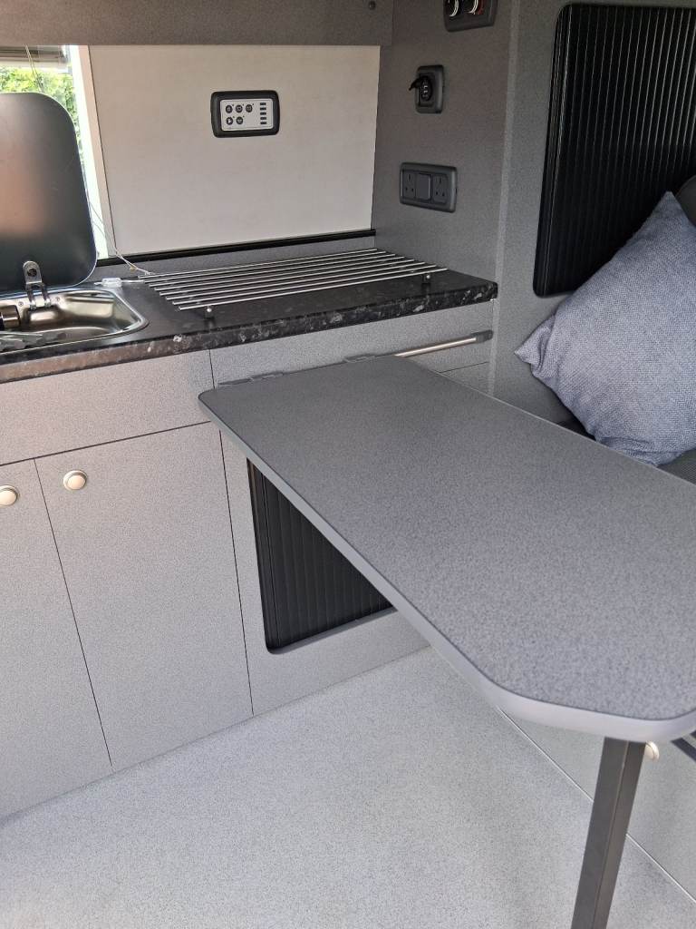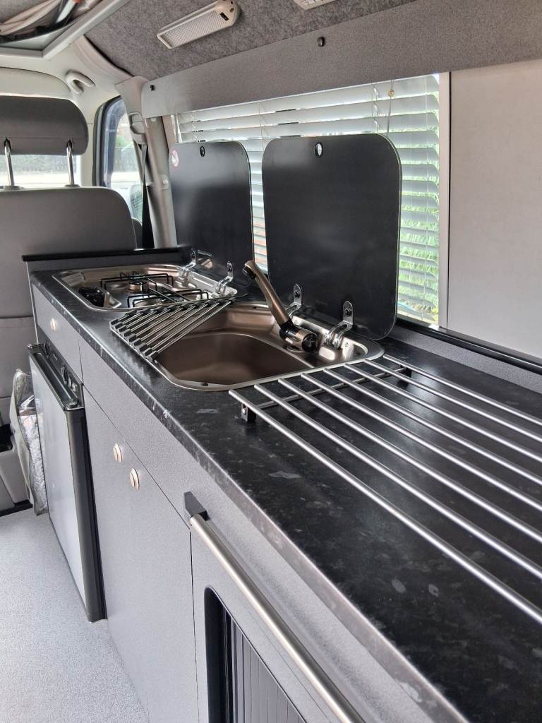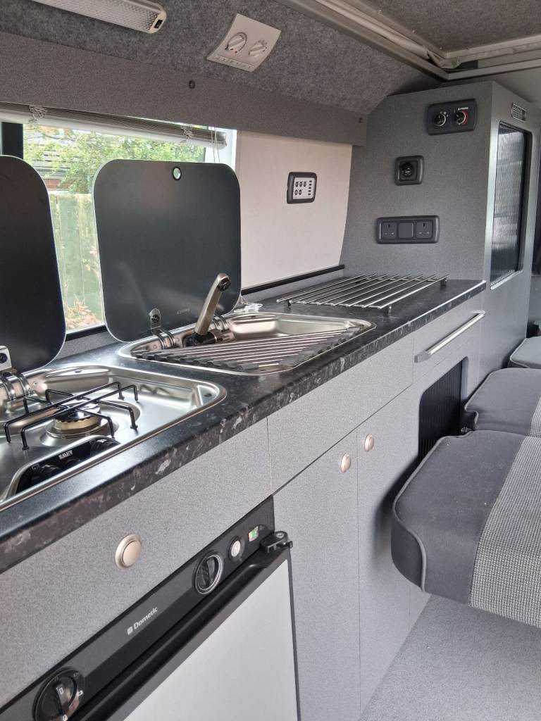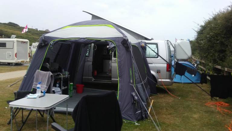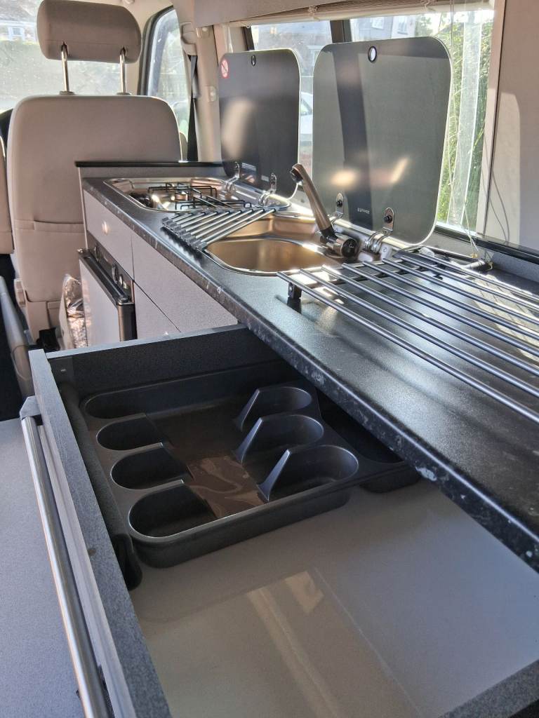Silver 2011 LWB T5 Volkswagen, a lovely well looked after campervan that has everything you need for your adventures, including a Outdoor Revolution Cayman Air drive away awning (used 3 times) and a Fiamma bike rack & Fiamma Big Box storage. (as in photos)