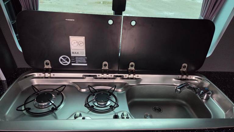 12v Fridge, two gas ring burner and specially fitted gas box for gas bottle underneath sink with venting.