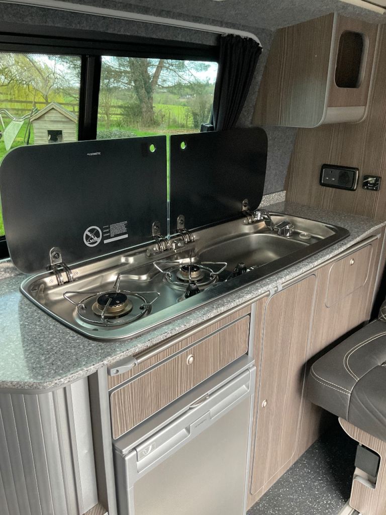 Staron work surface with a Dometic two ring gas burner and sink with cold water tap.