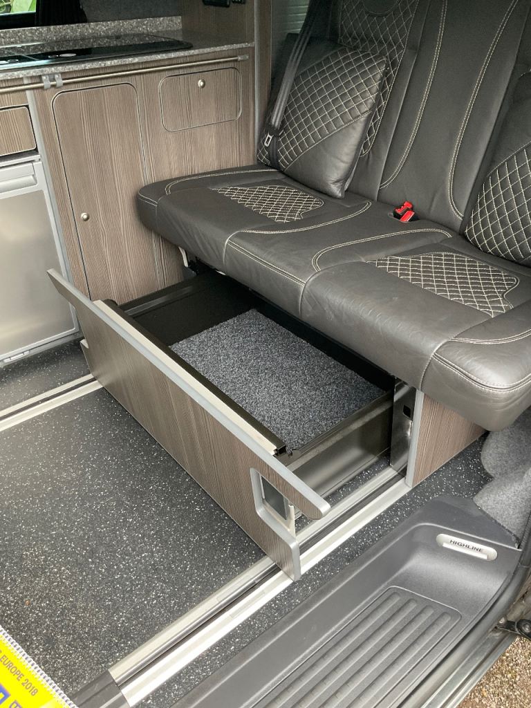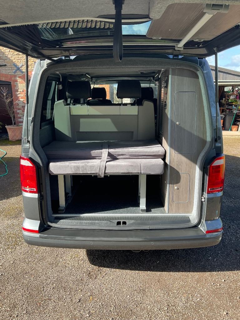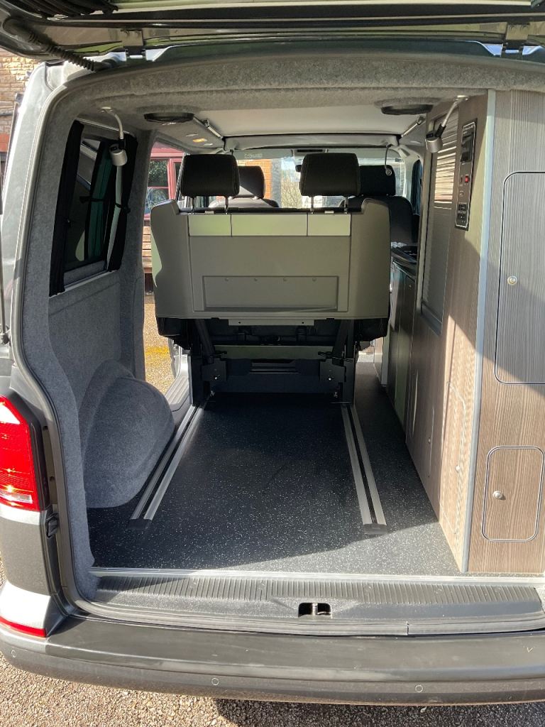 VW California rear seat on rails that slides forwards and drops to form a double bed with a memory foam mattress. The seat can be slid forward to give a larger boot space or you can even remove the rear part of the bed to give an extra large boot space(as shown in the photos).