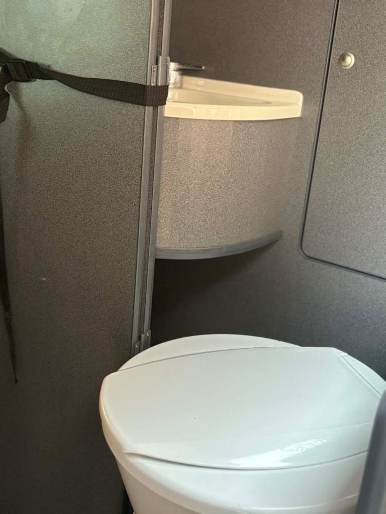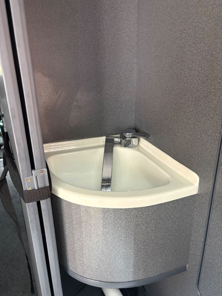 Domestic fixed cassette toilet with ceramic liner and hand basin.