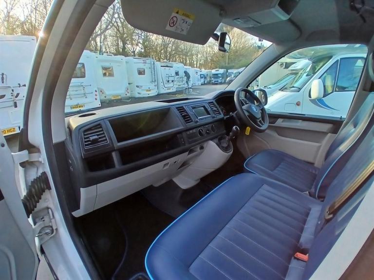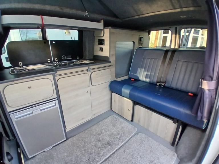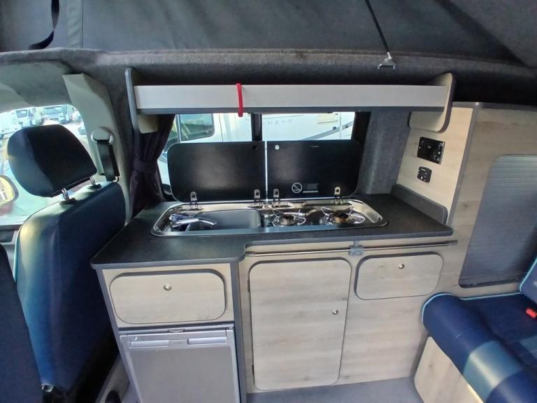 The interior layout: This Levante VW Pop Top camper conversion by Buyacamper is based on the Volkswagen Transporter T5.1 and offers a practical campervan layout with seating for five and a four-berth sleeping arrangement. The front cab features Twin front swivel Seat allowing them to rotate into the living area. Behind the cab is a rear travelling seat finished in blue faux leather trim with integrated seat belts, which converts into a comfortable Rock-Roll double bed and provides useful storage beneath. Above, the elevating pop-top roof provides a second double bed ideal for family members. The side kitchen unit is neatly integrated and fitted with a two-ring gas hob with electronic ignition, a sink with a tap and an onboard water container with a glass lid, along with a fridge. Storage cupboards and shelving are incorporated into the furniture with tambour door access providing practical storage for touring equipment and cooking utensils.